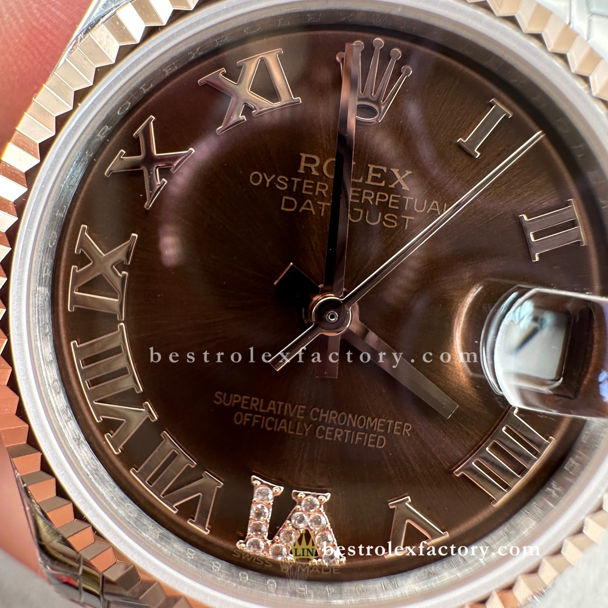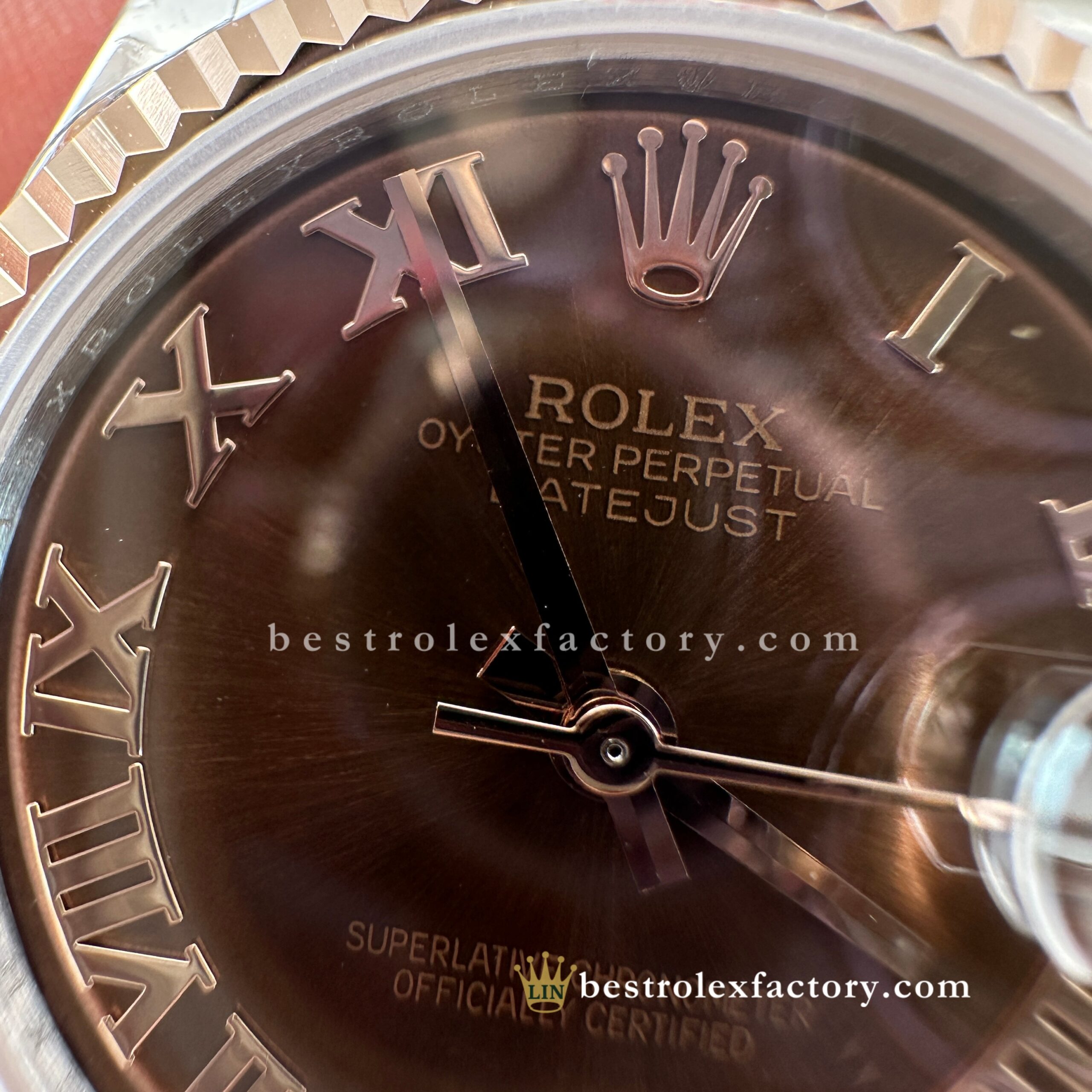 - The chocolate dial is a standout—deep and rich, with bronze and mahogany undertones that shift subtly in different lighting. In direct sun, it takes on a soft, milk chocolate sheen; in shadow, it deepens into dark espresso, accented by burnished bronze highlights that pair perfectly with the warmth of Everose gold. Achieving this exact hue at a 31mm scale is no easy task. Clean Factory uses spectrophotometric analysis to ensure that each dial delivers the same color depth and warmth as the genuine Rolex reference.