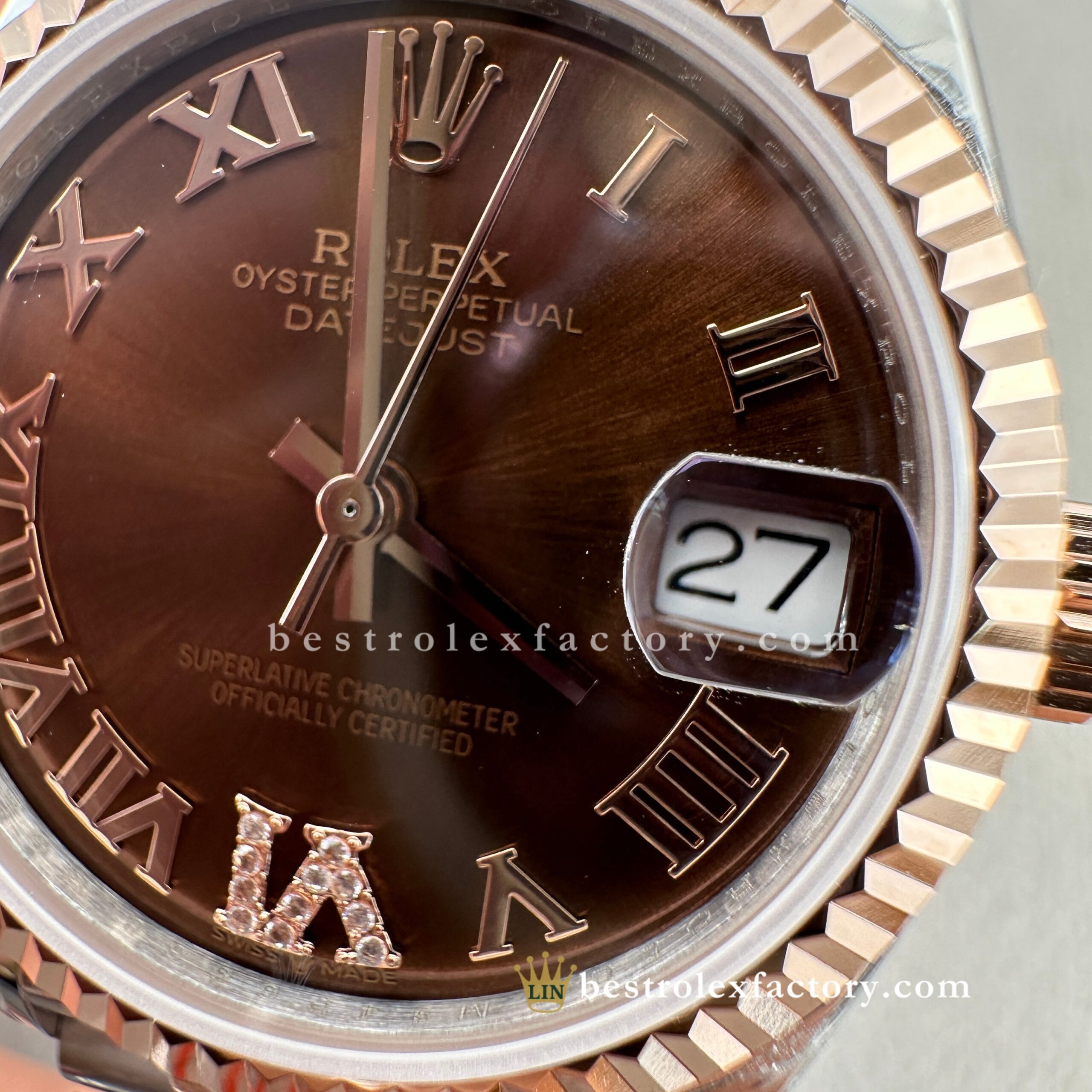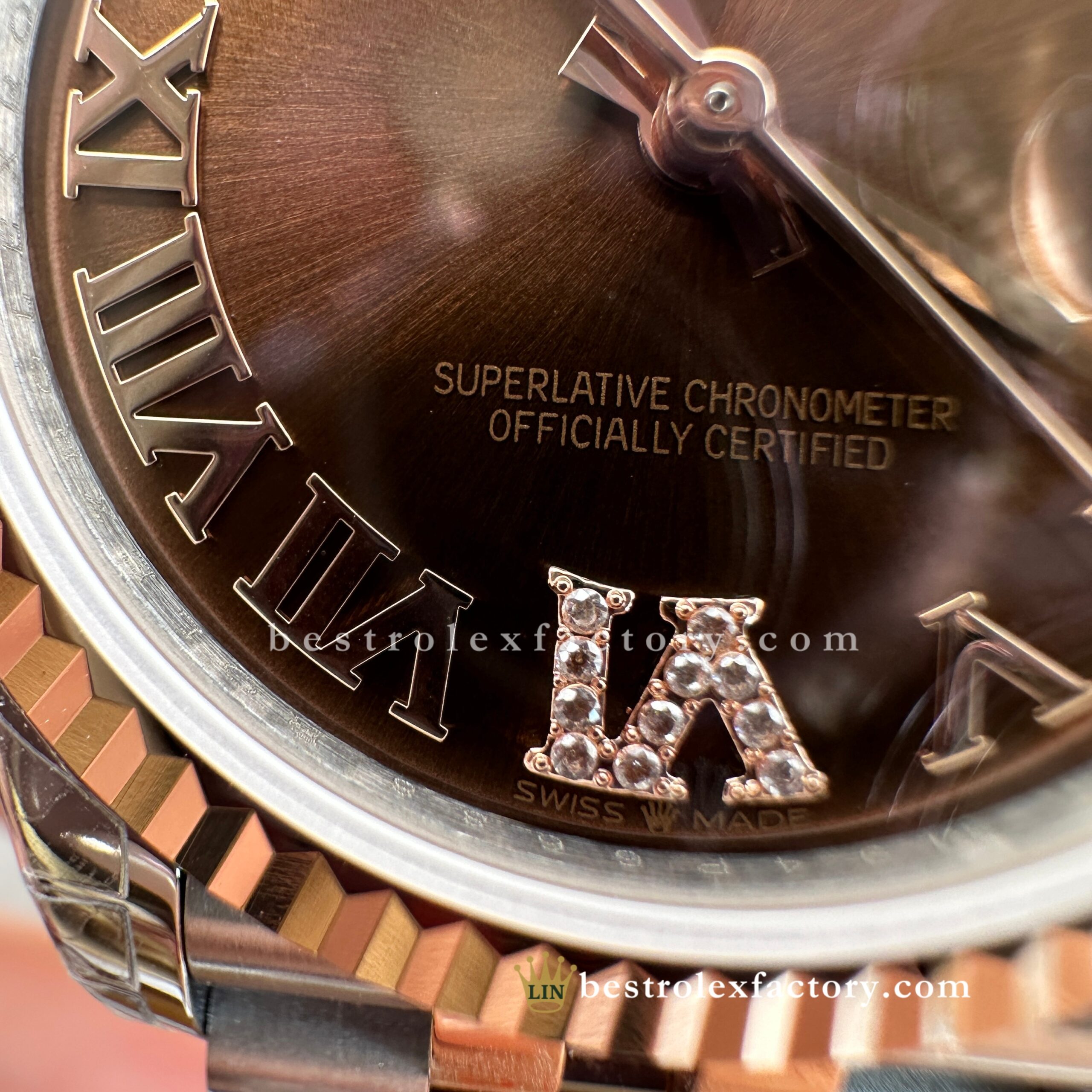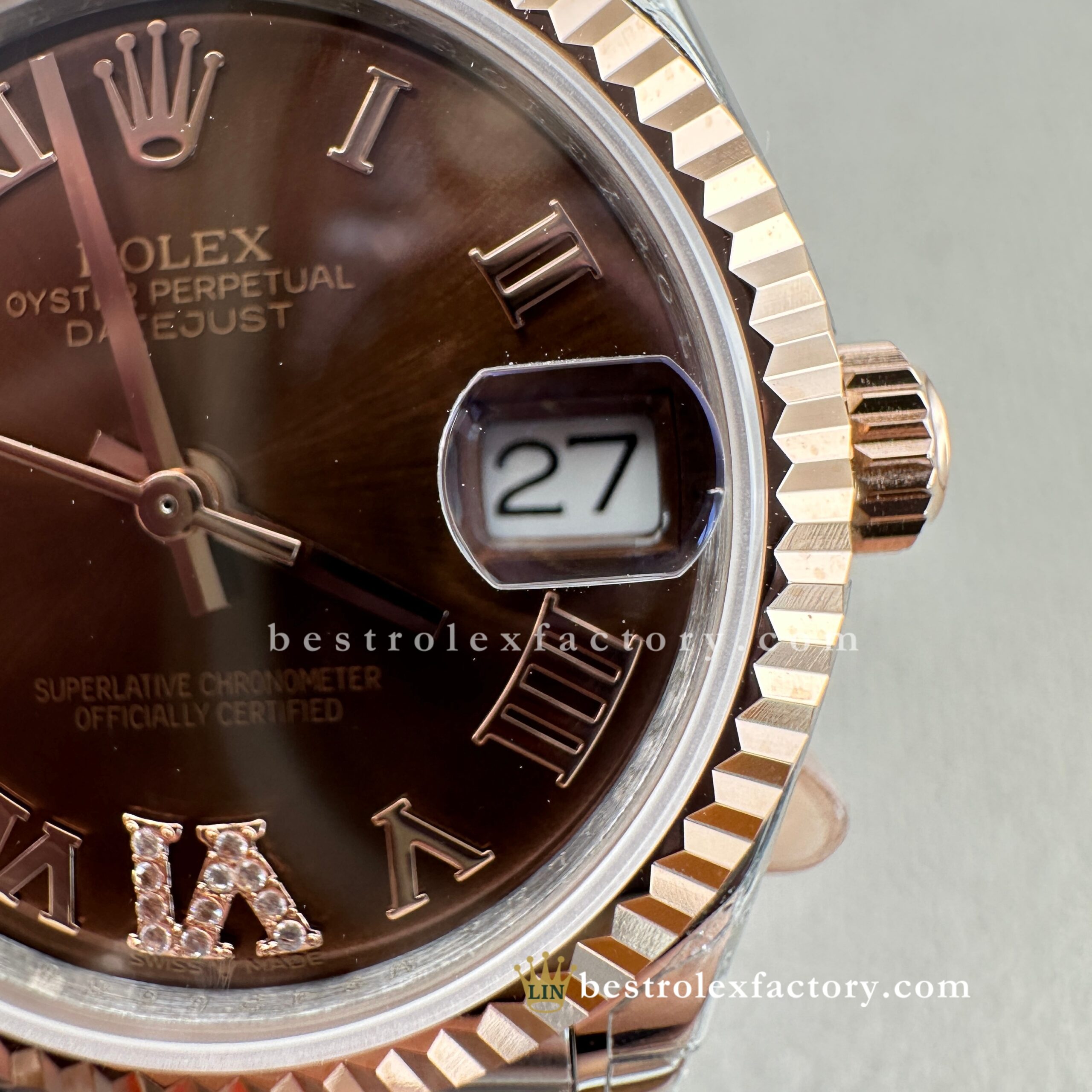 - Clean Factory’s Super Clone Rolex Lady Datejust 278271-0004 features the richly elegant chocolate sunburst dial with diamond-set Roman numerals, housed in a refined 31mm two-tone Everose gold case. This warm, indulgent configuration highlights Clean Factory’s expertise in replicating Rolex’s most sophisticated and luxurious designs for women. From the precise chocolate tone to the enduring glow of real Everose gold and the specialized super clone 2236 movement, every detail is carefully executed to match authentic standards.