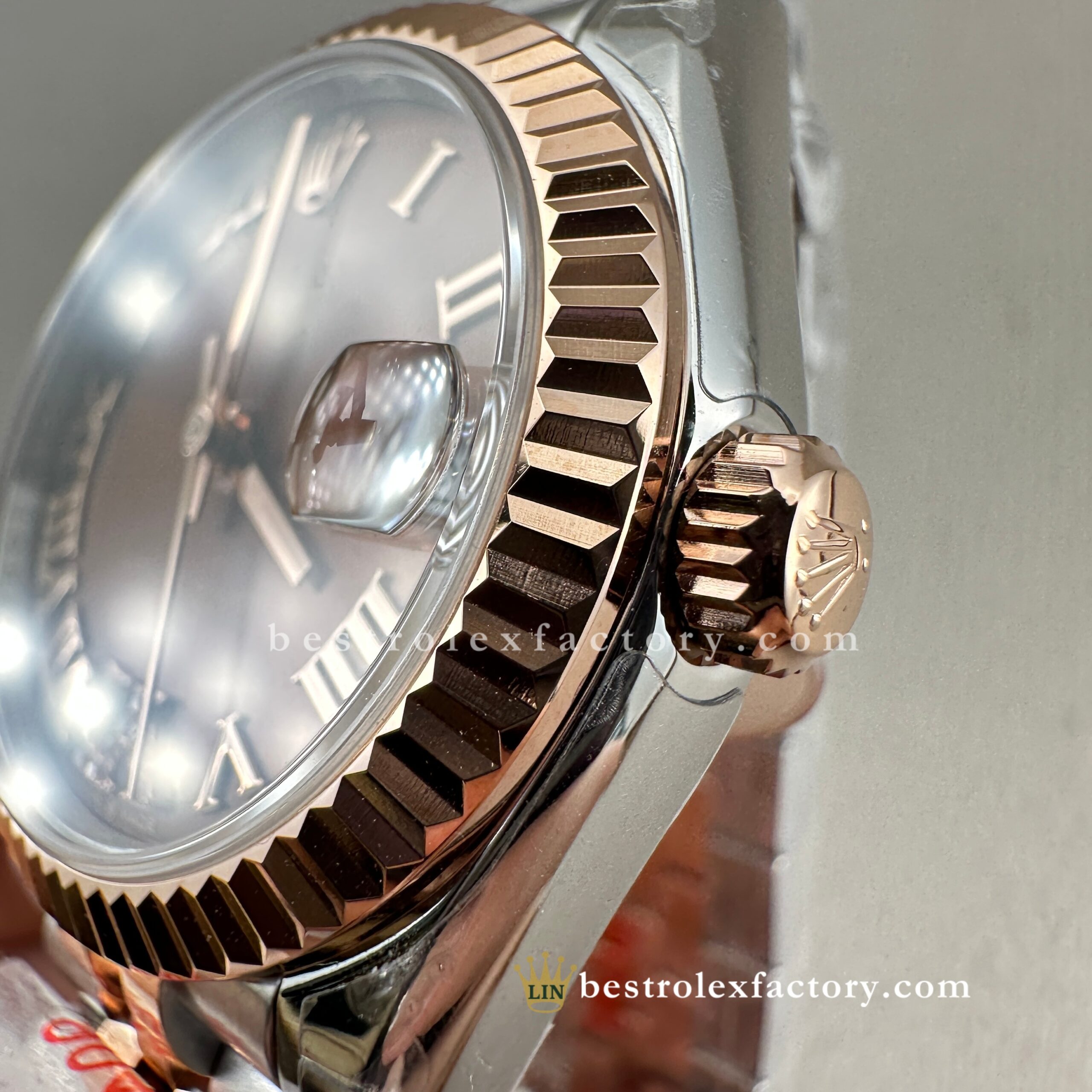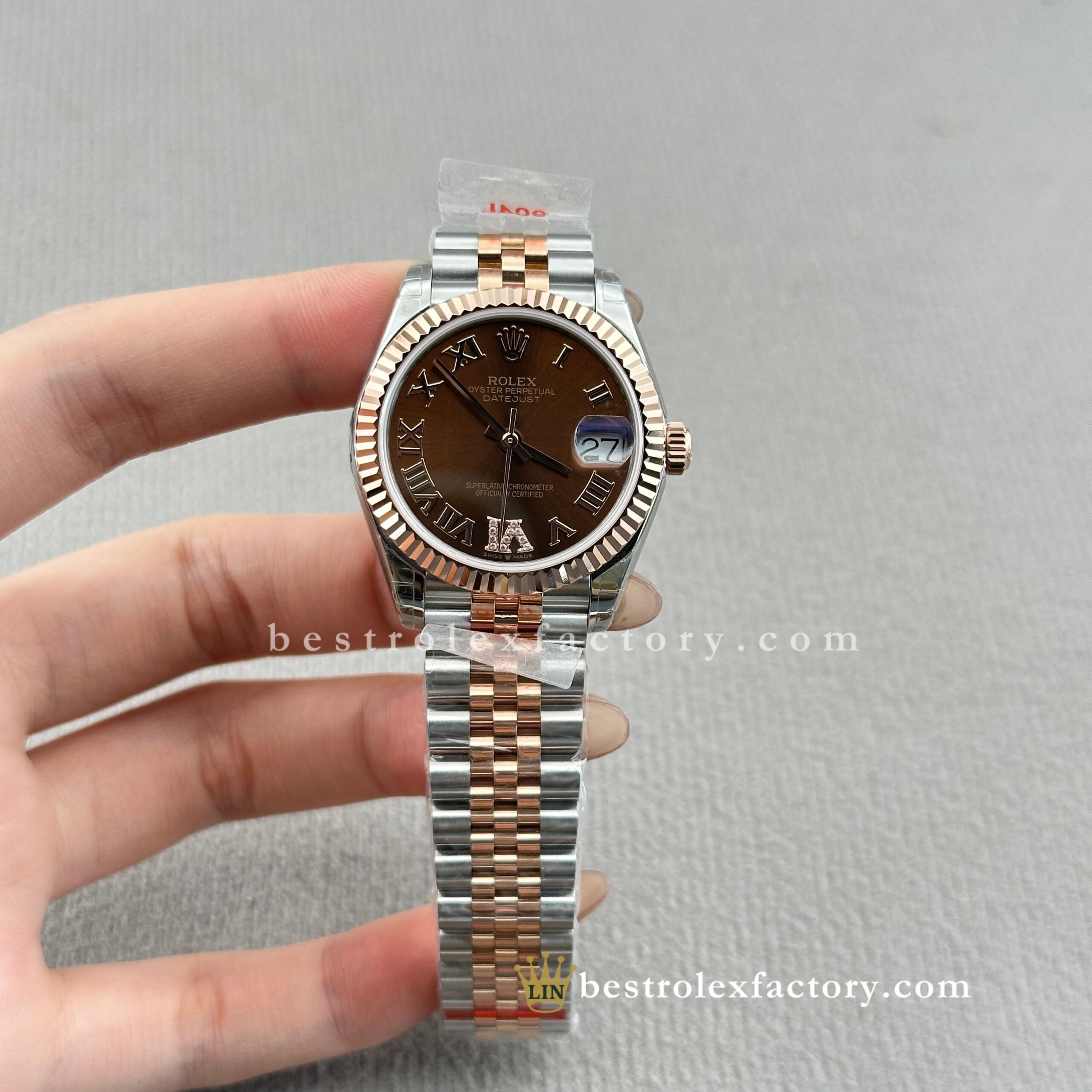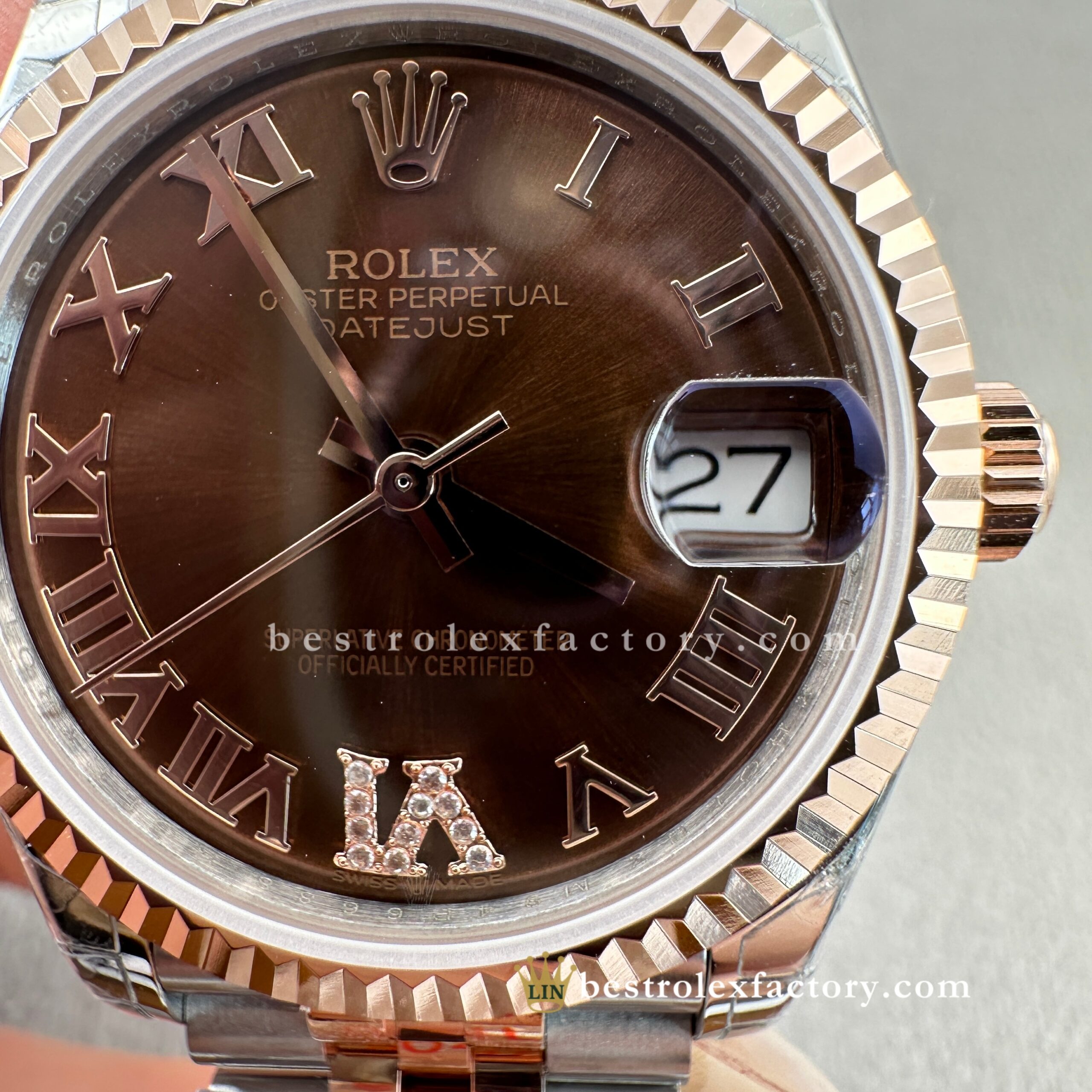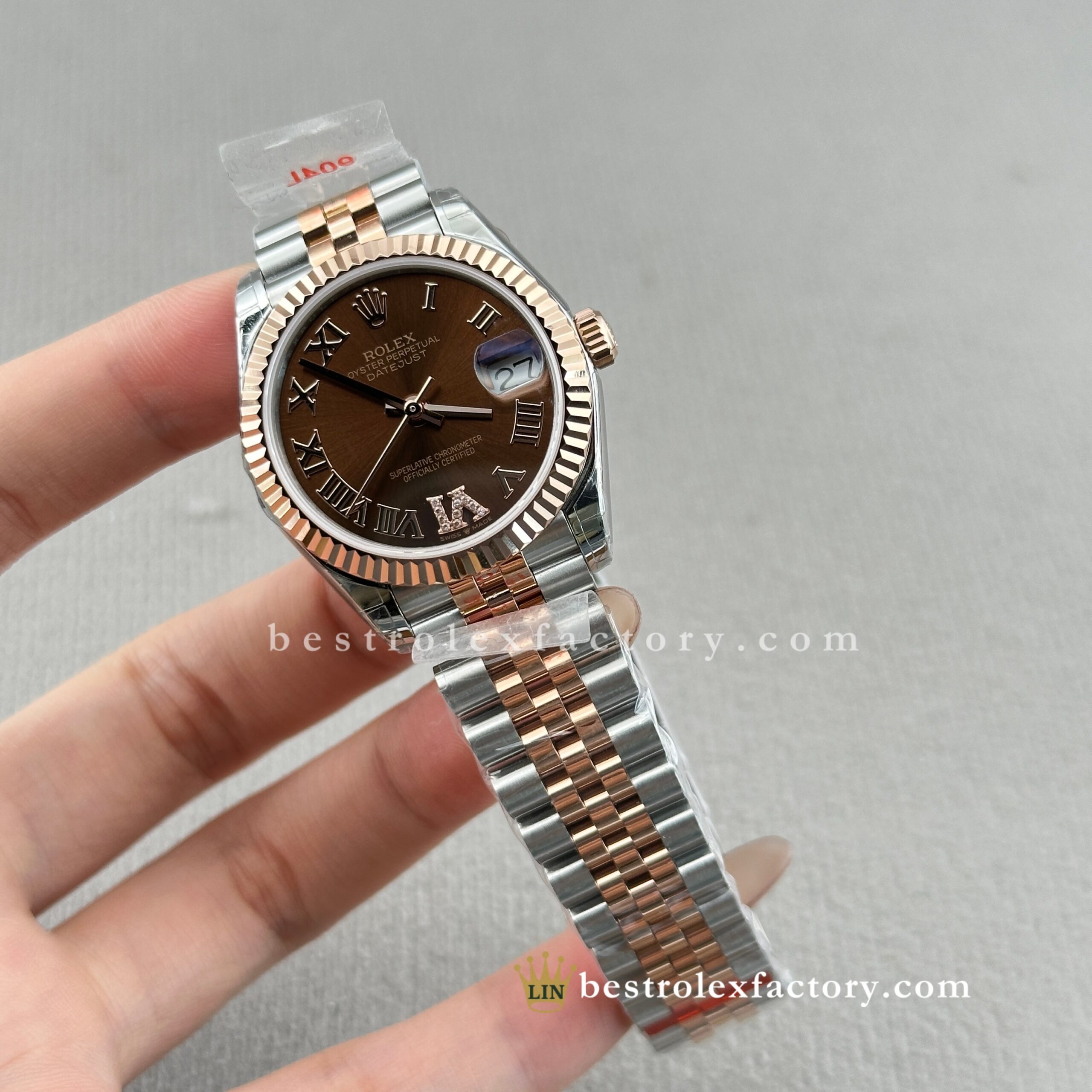 - Clean Factory’s Super Clone Rolex Lady Datejust 278271-0004 features the richly elegant chocolate sunburst dial with diamond-set Roman numerals, housed in a refined 31mm two-tone Everose gold case. This warm, indulgent configuration highlights Clean Factory’s expertise in replicating Rolex’s most sophisticated and luxurious designs for women. From the precise chocolate tone to the enduring glow of real Everose gold and the specialized super clone 2236 movement, every detail is carefully executed to match authentic standards.