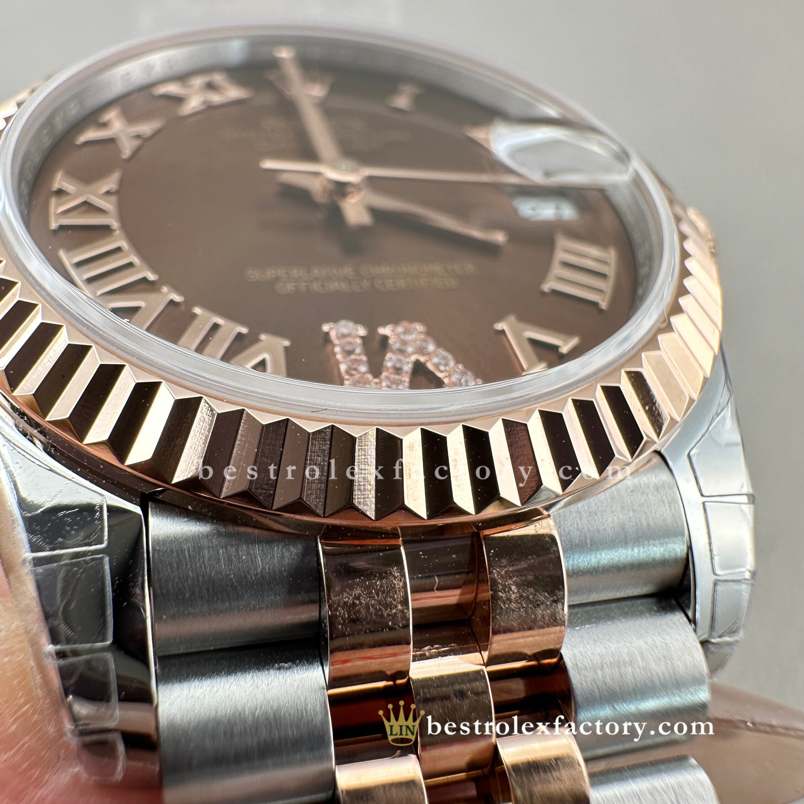 - Everose gold brings warmth and cohesion to the entire watch. Clean Factory’s proprietary formula blends real gold with platinum to ensure the tone never fades or tarnishes over time. This material doesn’t just look the part—it behaves like solid gold, developing a subtle patina that enhances the watch’s beauty as it’s worn. On the fluted bezel, each of the 48 grooves is sharply defined and fully coated, offering brilliance that dances with movement and complements both the chocolate dial and diamond numerals.