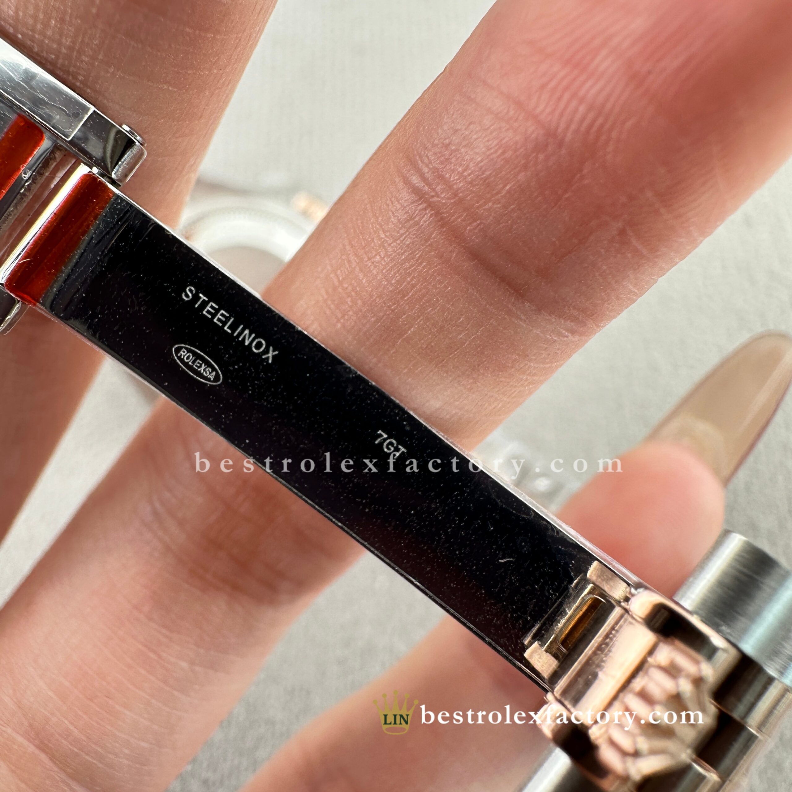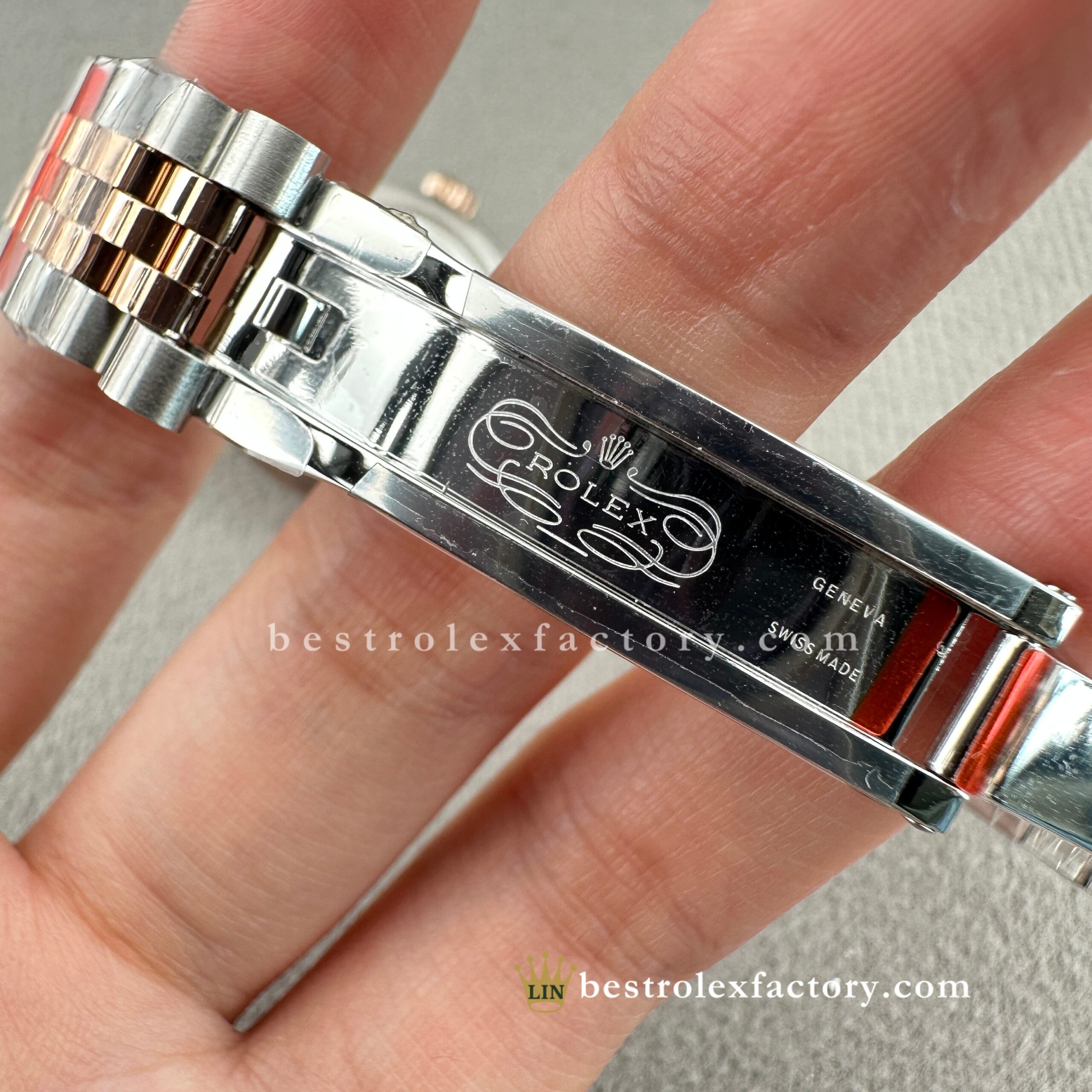 - Completing the piece is the two-tone Jubilee bracelet, scaled and finished to perfection. The polished Everose center links echo the warmth of the dial, while the brushed steel outer links add cool balance. Each link is finished to exacting standards, and the concealed clasp closes with seamless precision.