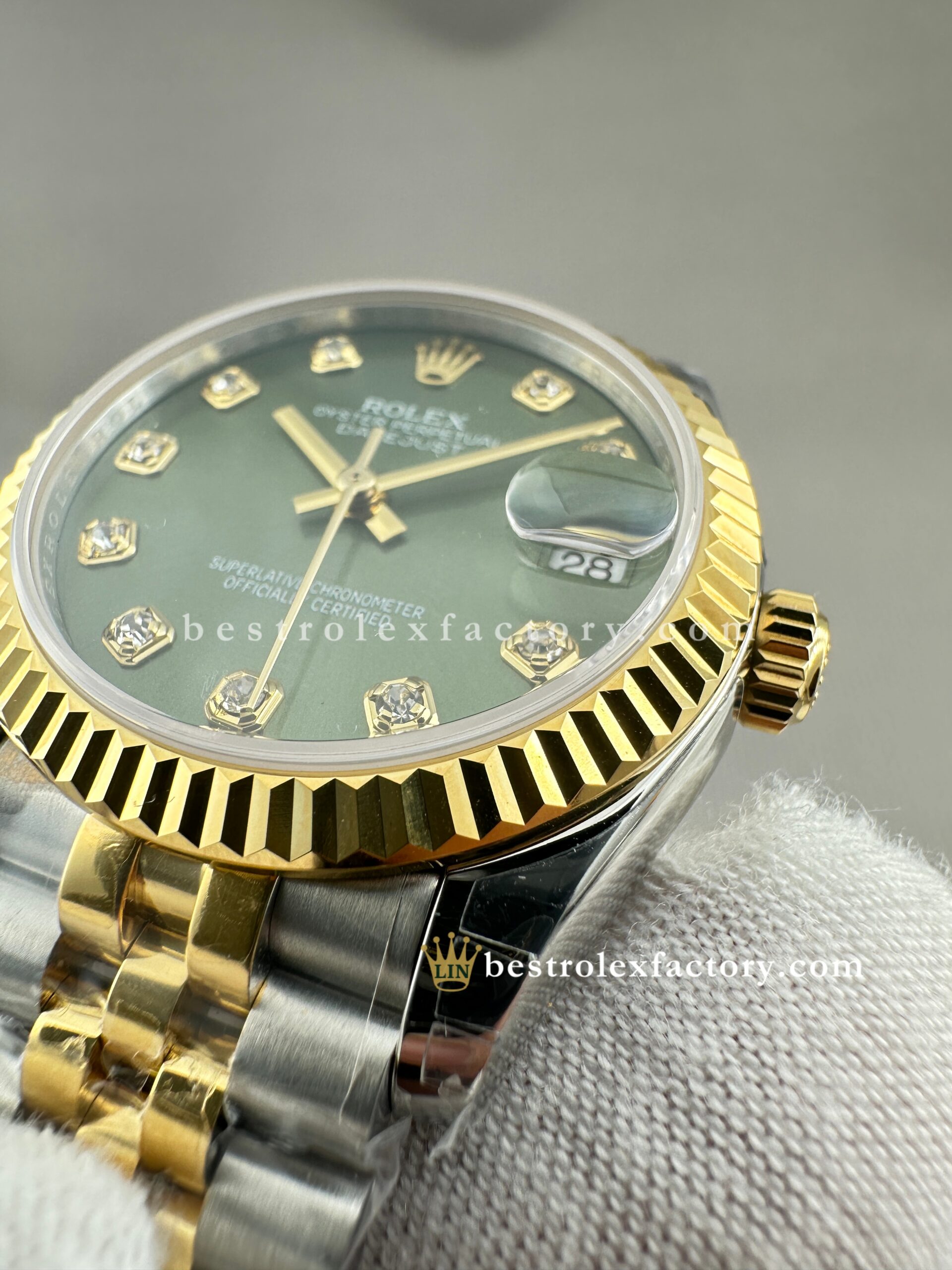 • The fluted bezel, also done in yellow gold, is especially elegant at this scale. At 31mm, the sharp ridges of each flute seem more delicate, almost jewel-like, creating a subtle shimmer as the watch moves. Paired with the olive dial and sparkling markers, the overall aesthetic is warm and luxurious—never loud.