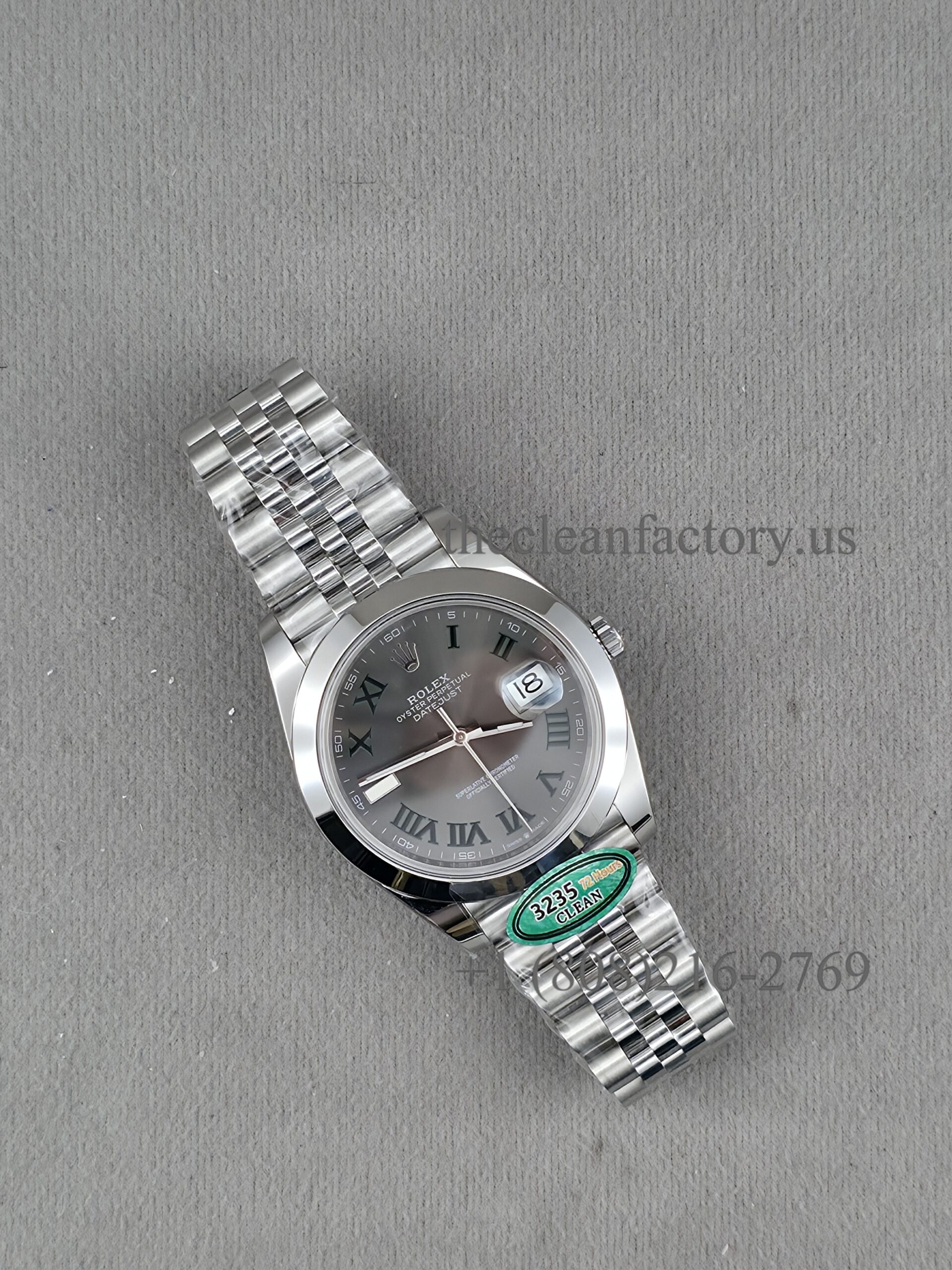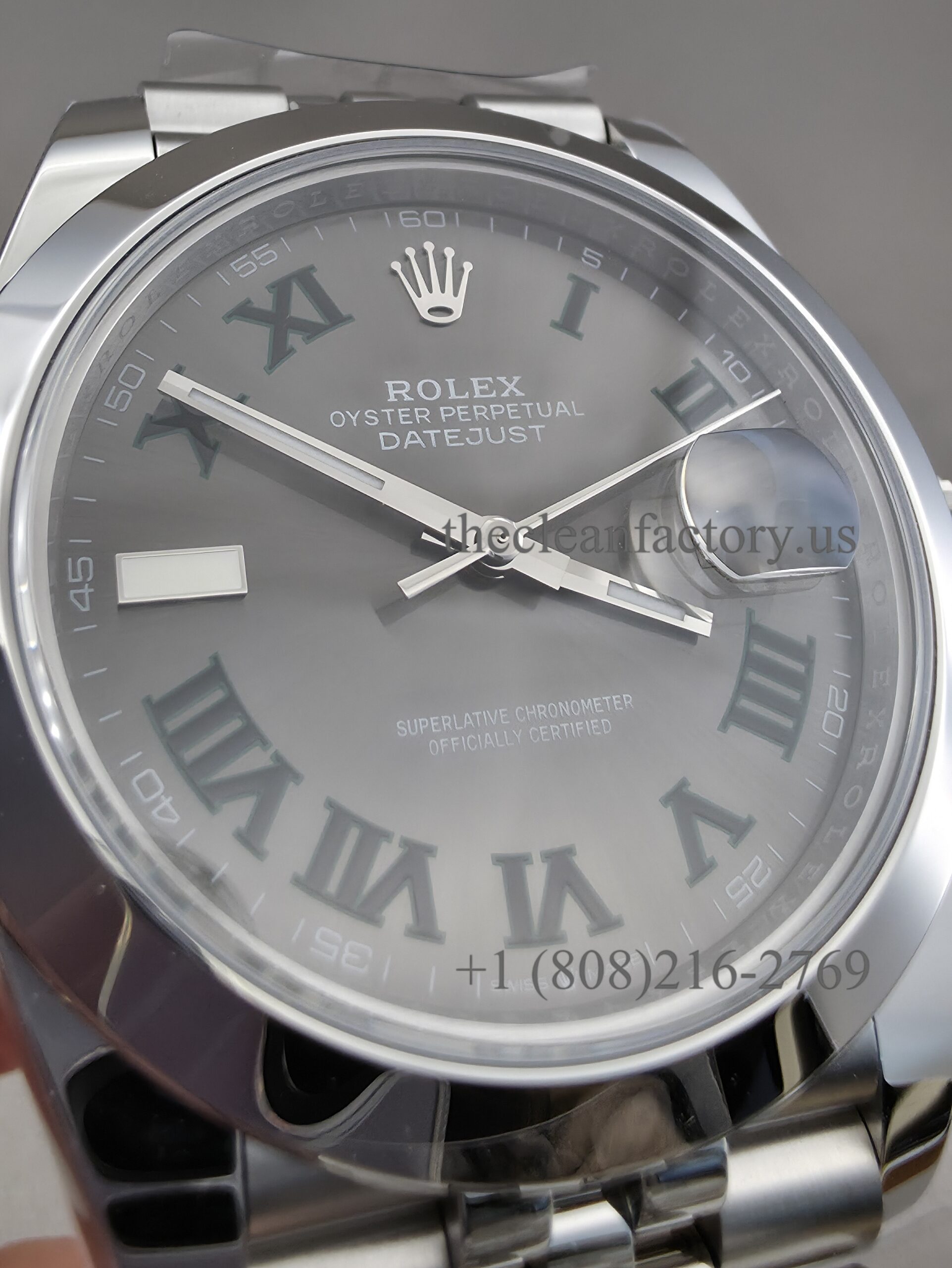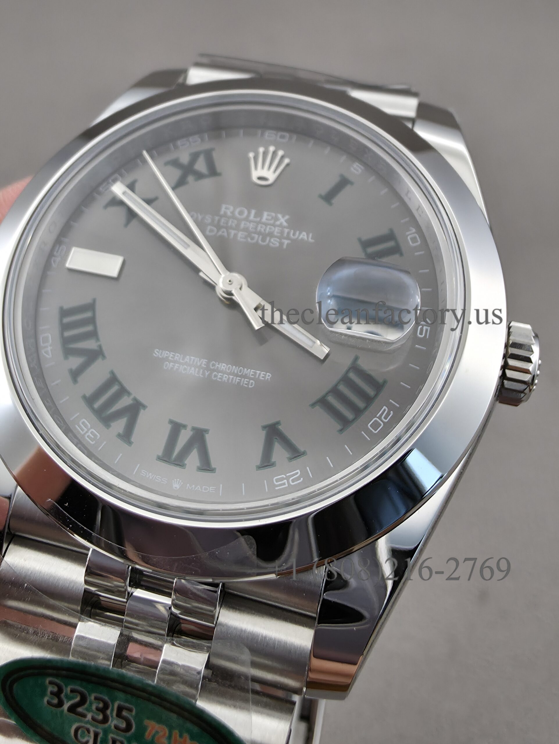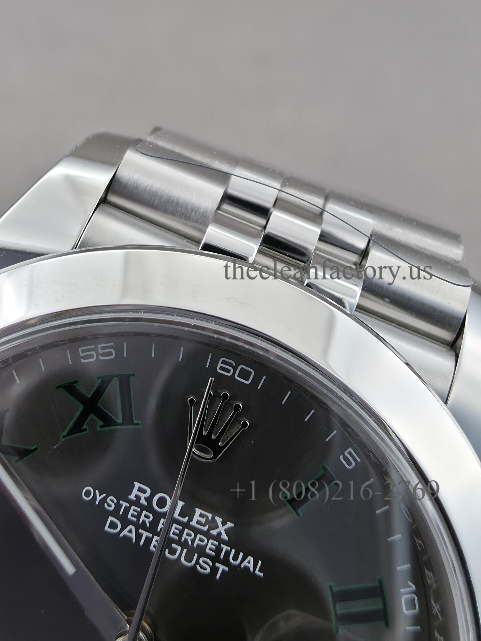 - Clean Factory's Rolex Datejust 126300-0014 with Wimbledon dial and Jubilee bracelet tackles two of the hardest challenges in watch replication simultaneously. Most factories won’t even attempt the Wimbledon dial because getting both the slate grey base and green Roman numerals right requires expensive equipment and techniques they don’t have. Add the Jubilee bracelet’s five-piece link complexity, and you have a combination that separates serious manufacturers from the budget players.