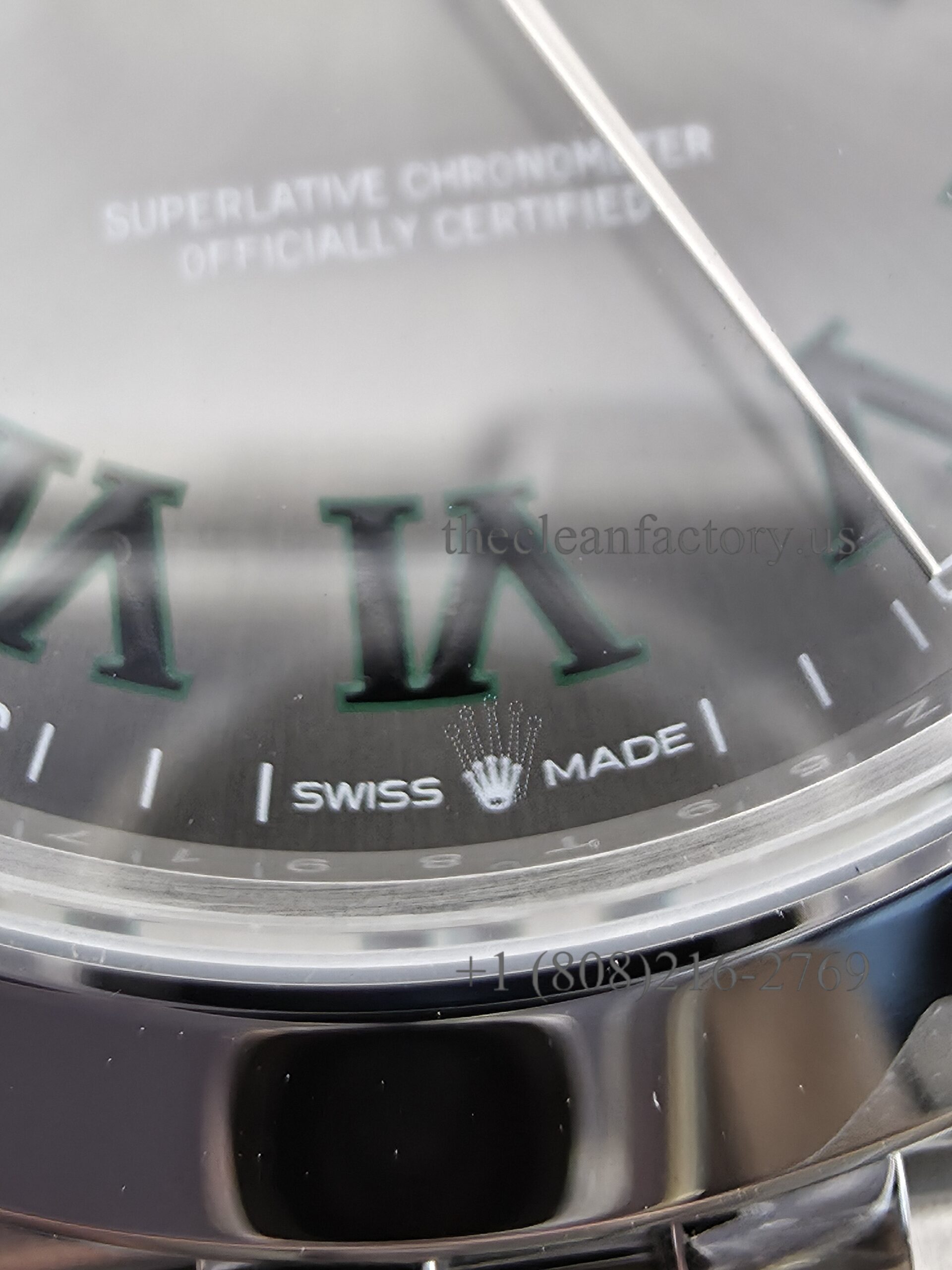 - Getting the green Roman numerals right is where most attempts fail completely. Each numeral shape and technology matches genuine specifications exactly—not just the color, but the actual dimensions, weight, and positioning. The VI at 3 o’clock needs special engineering because the date window interrupts it, requiring careful design to keep the classical proportions intact. Clean Factory uses the same PVD process for the green as the dial base, ensuring both colors stay consistent over time.