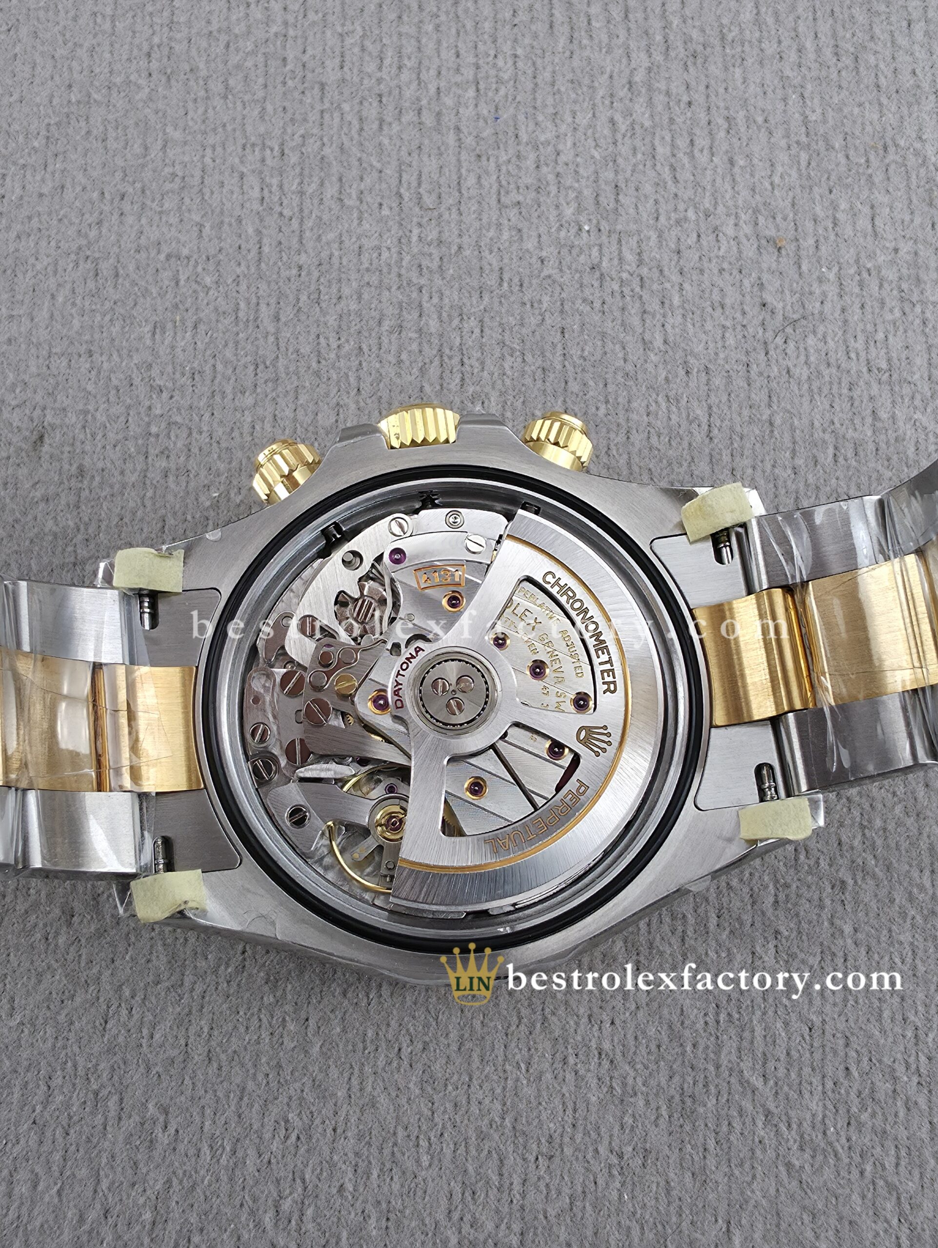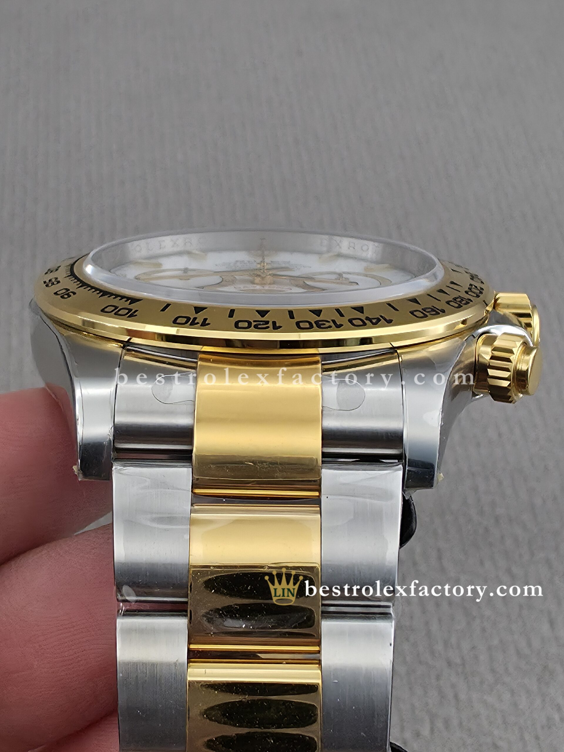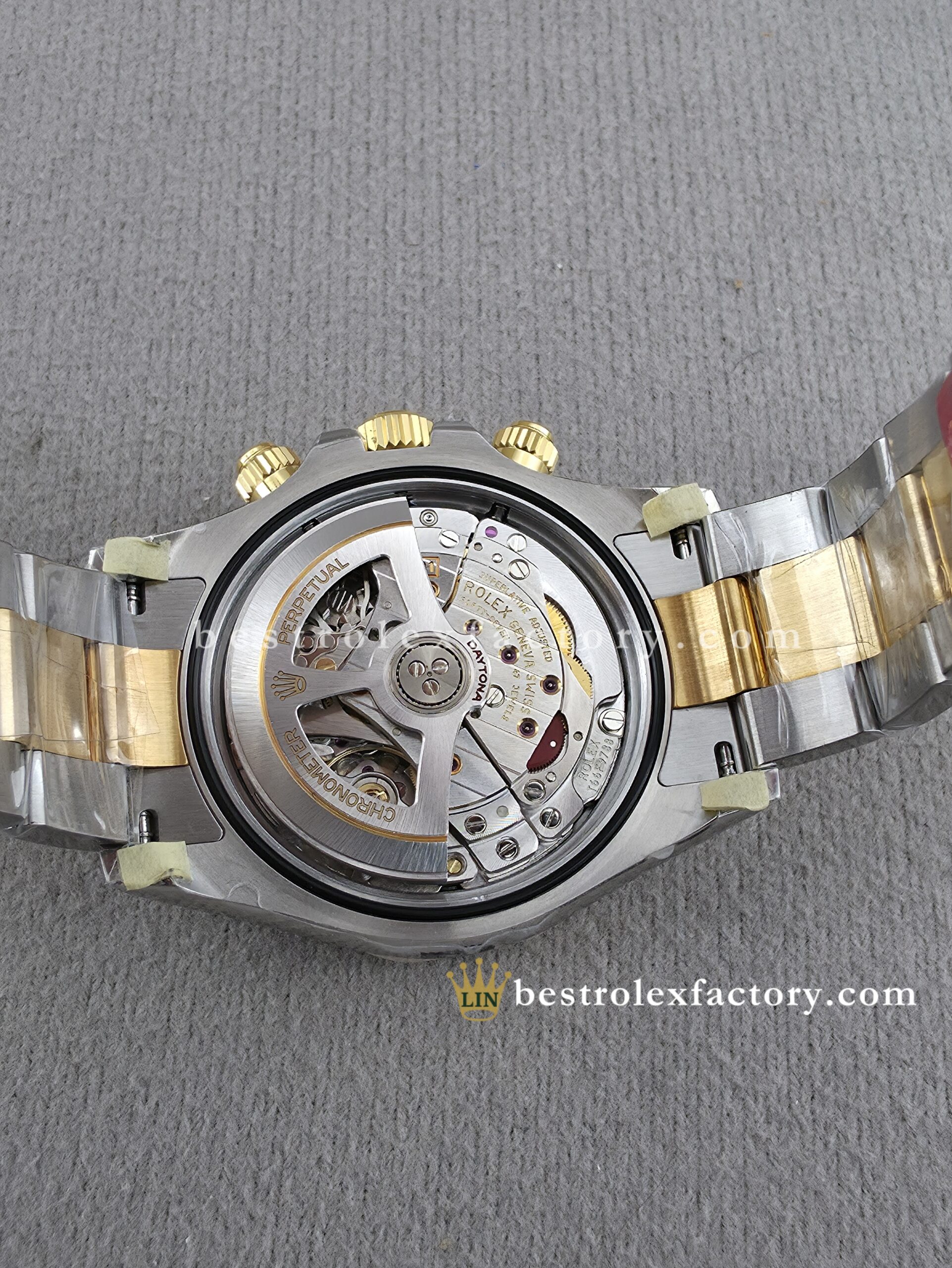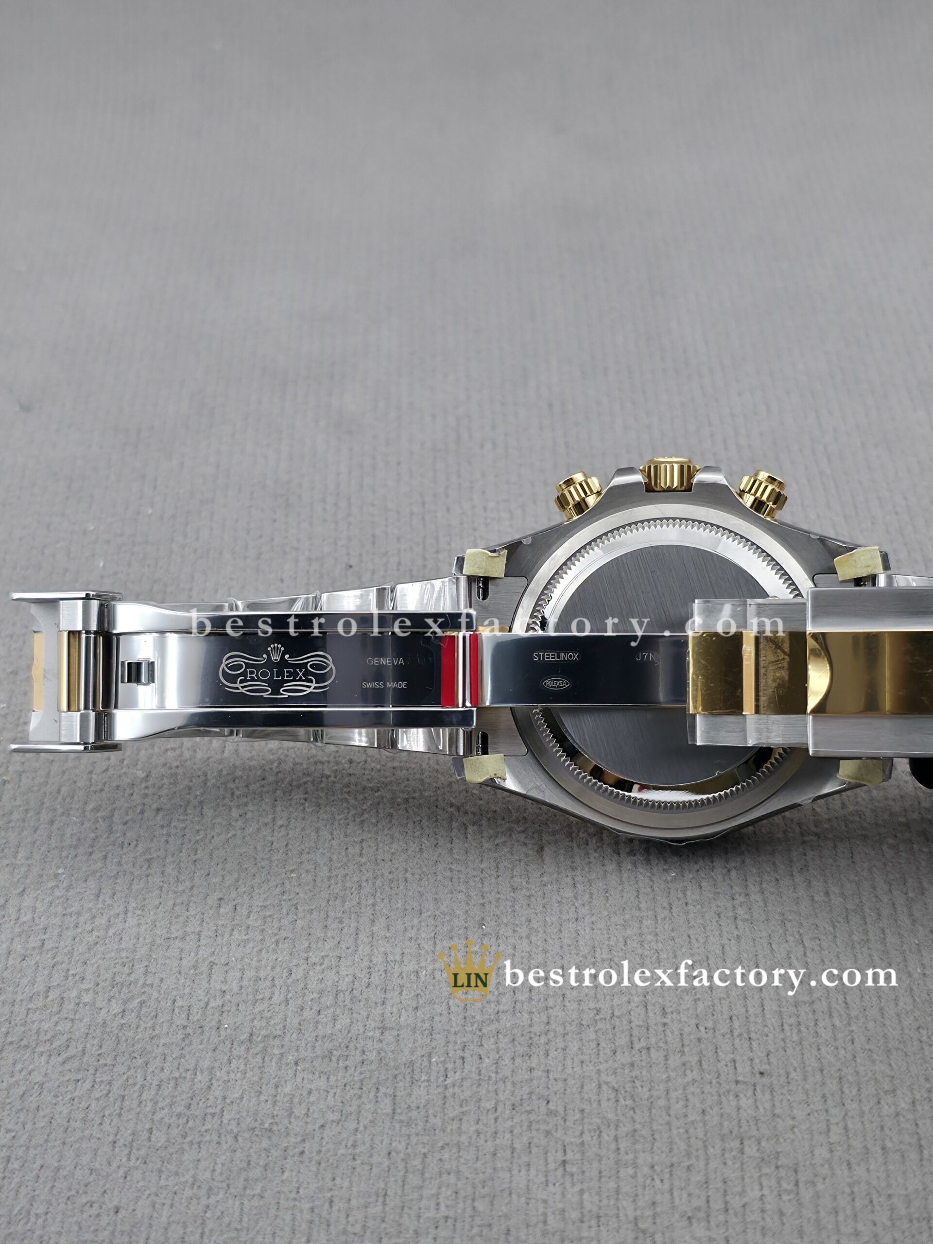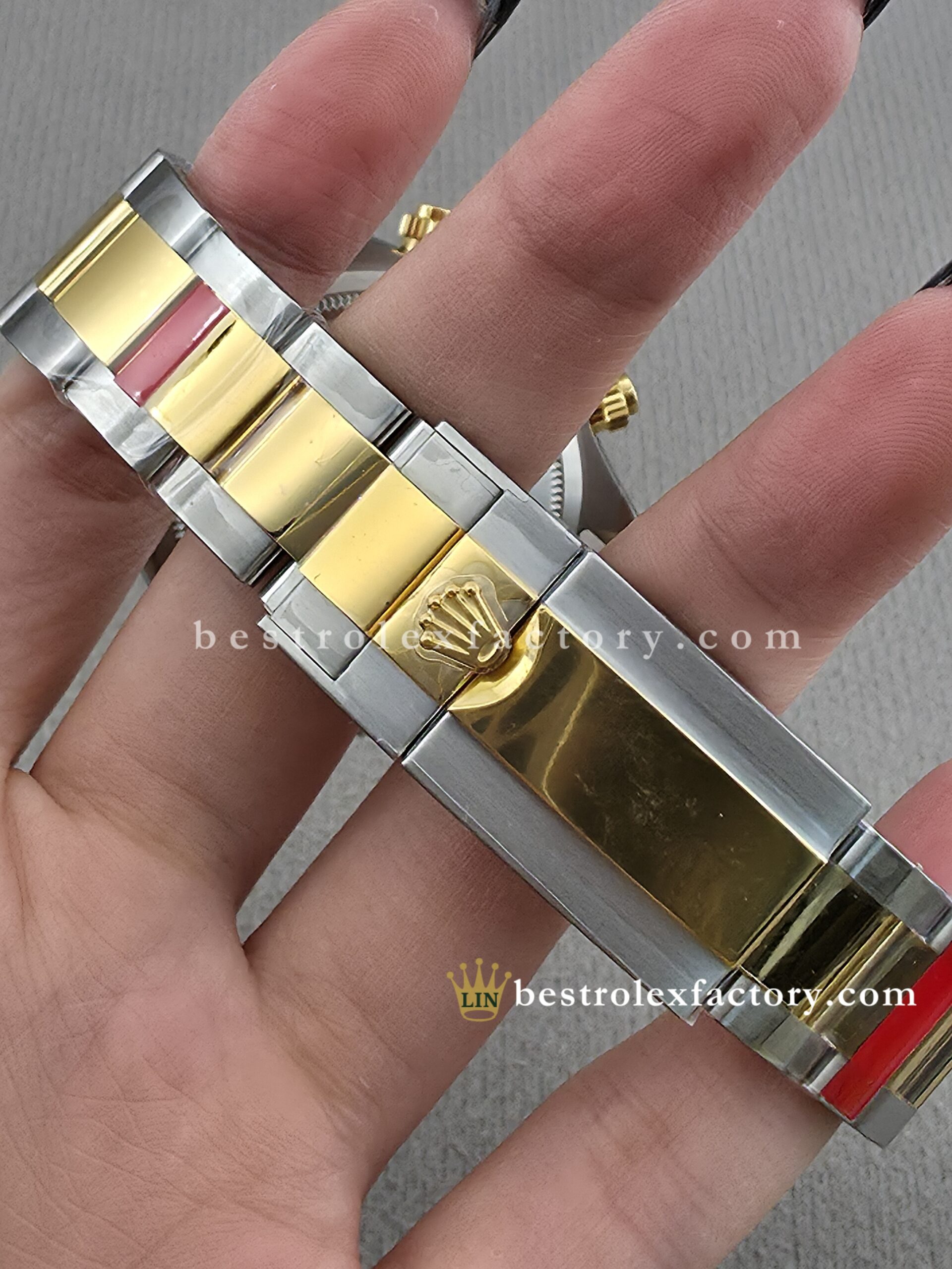• The case and bracelet are crafted in 904L stainless steel wrapped in thick 18k yellow gold—not thin plating that wears through after a season. Each link is machined to precise tolerances with clean transitions between brushed steel and polished gold. The Oysterlock clasp includes the Easylink 5mm extension system, so you can micro-adjust the fit just like the genuine. On the wrist, you feel the difference—everything fits and finishes perfectly.