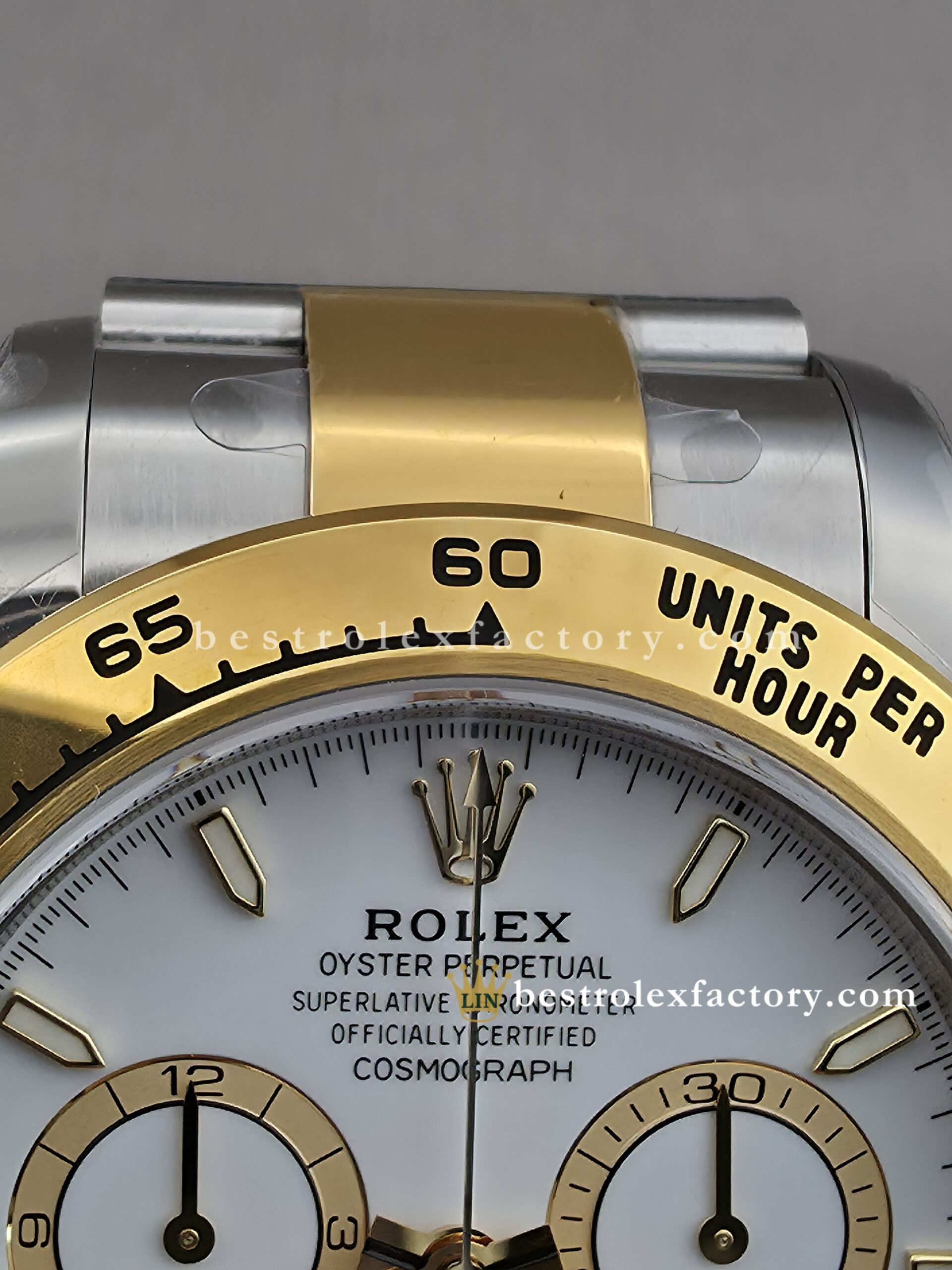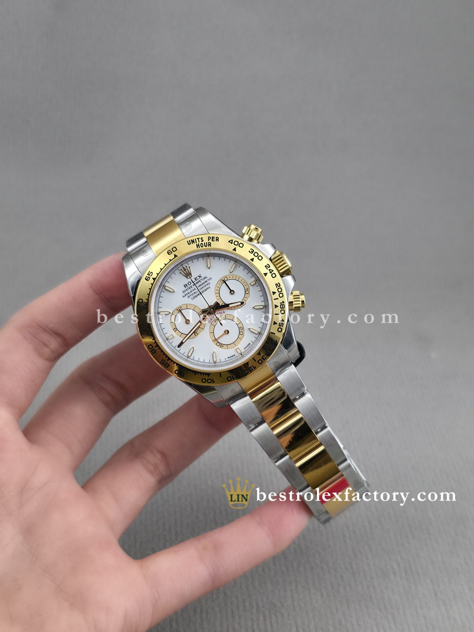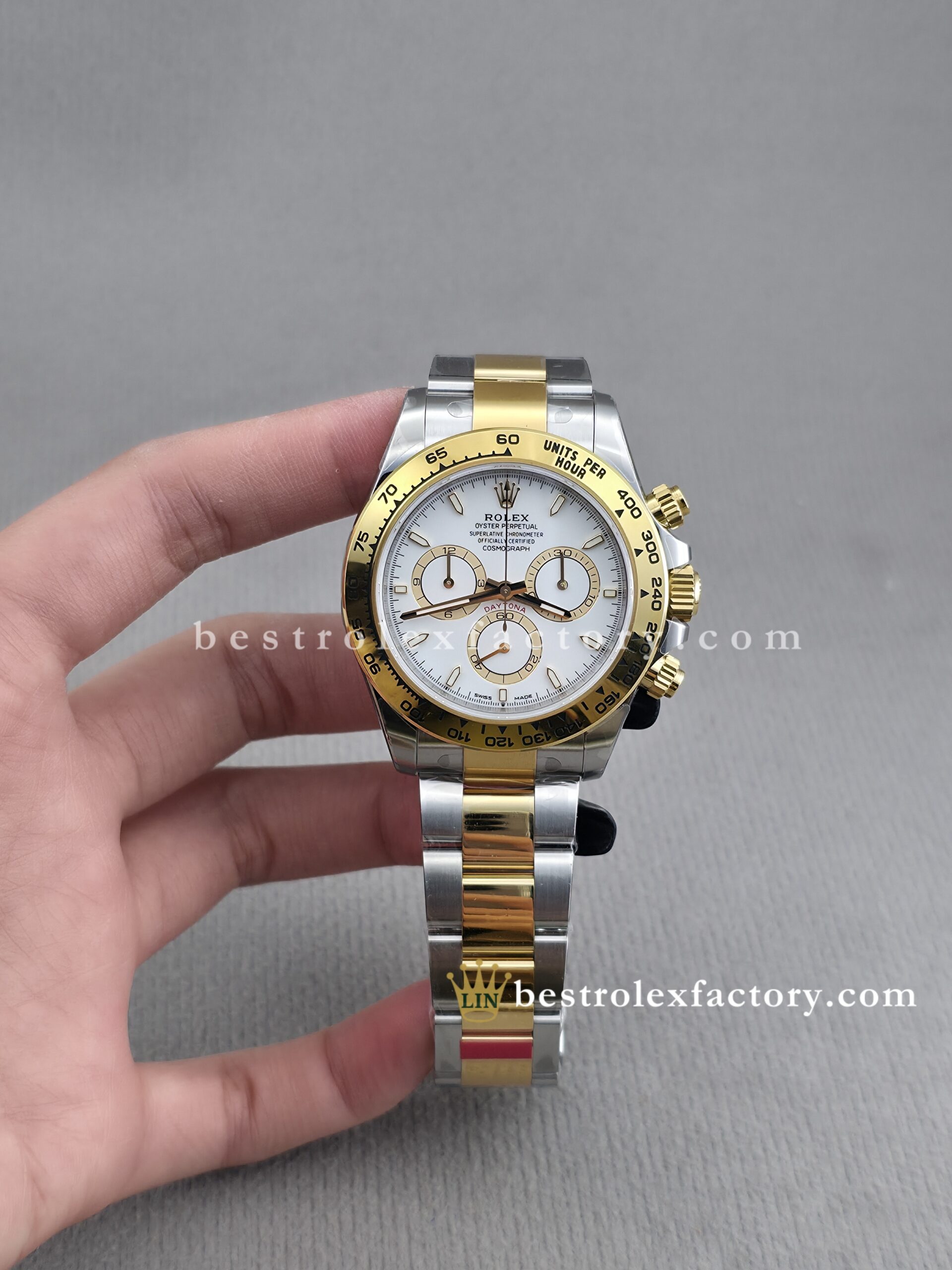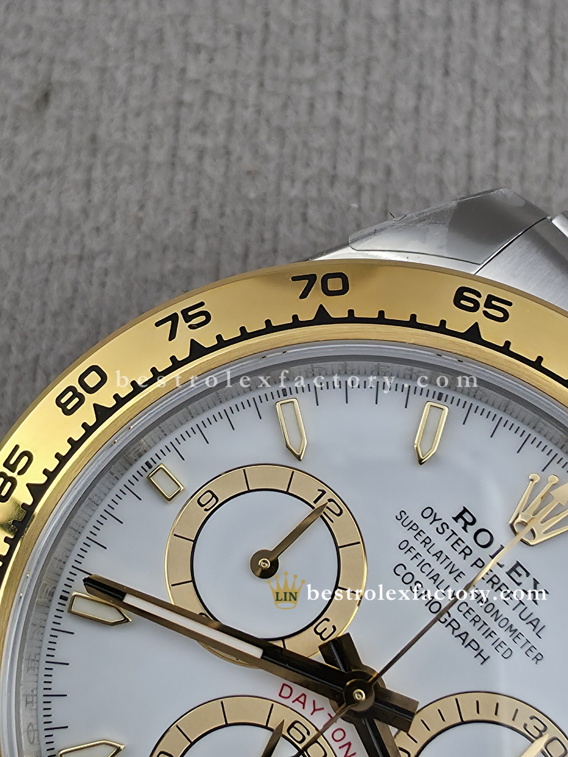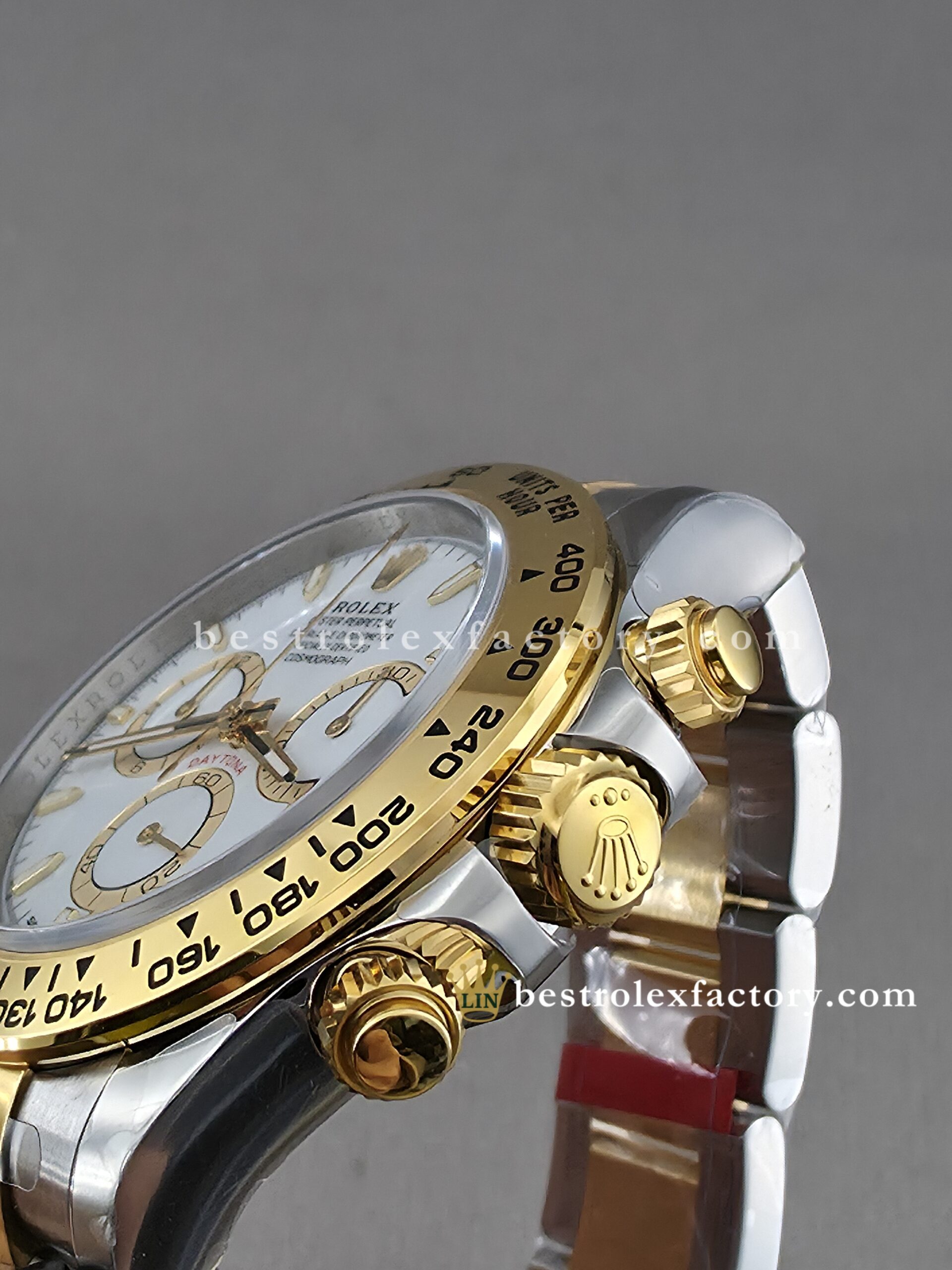 • The case and bracelet are crafted in 904L stainless steel wrapped in thick 18k yellow gold—not thin plating that wears through after a season. Each link is machined to precise tolerances with clean transitions between brushed steel and polished gold. The Oysterlock clasp includes the Easylink 5mm extension system, so you can micro-adjust the fit just like the genuine. On the wrist, you feel the difference—everything fits and finishes perfectly.