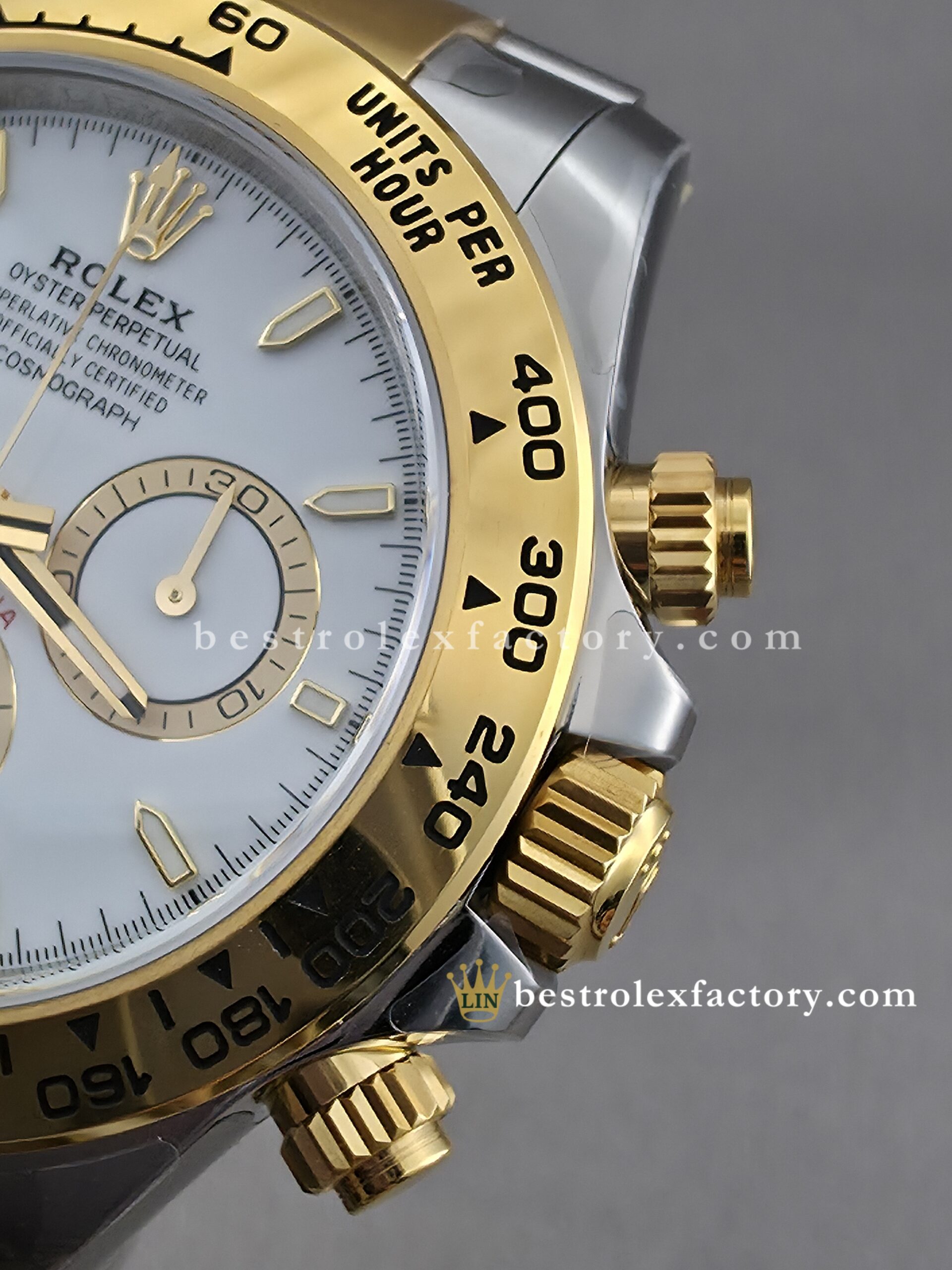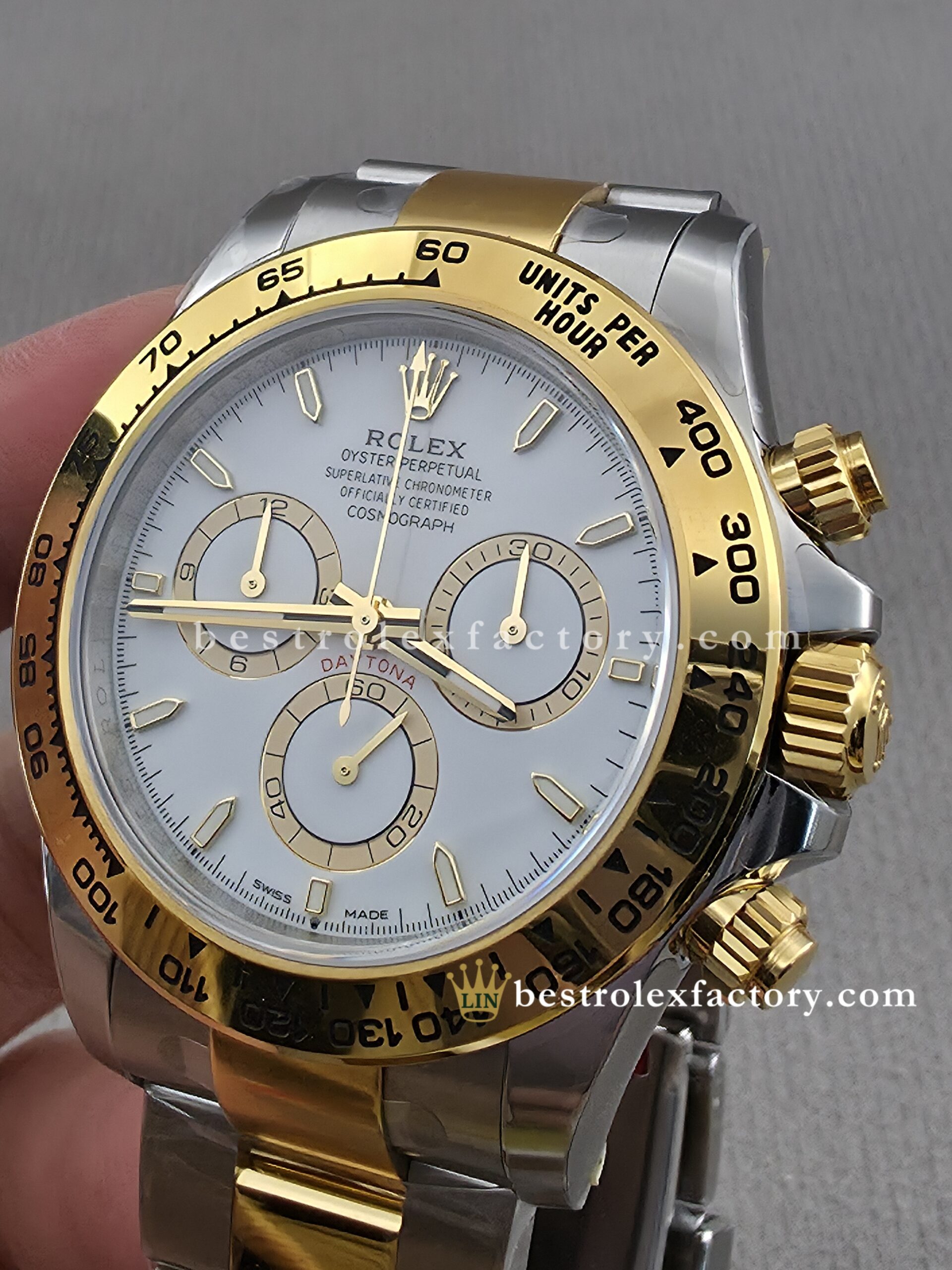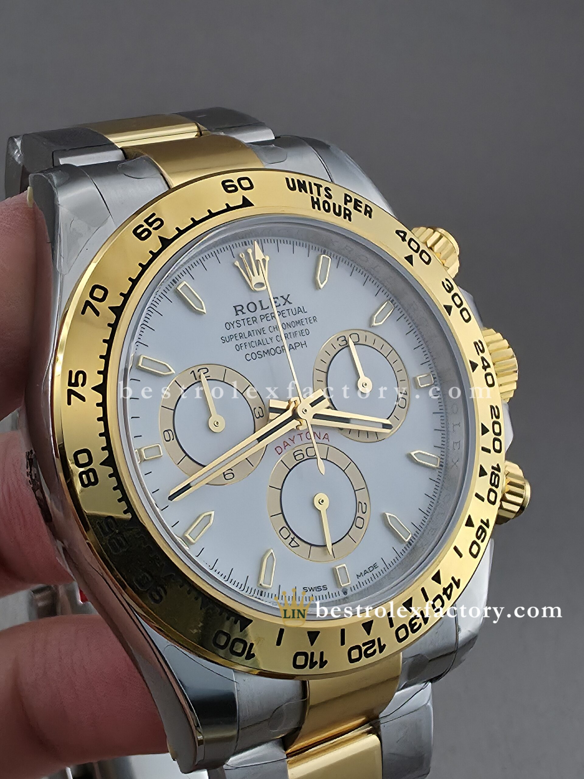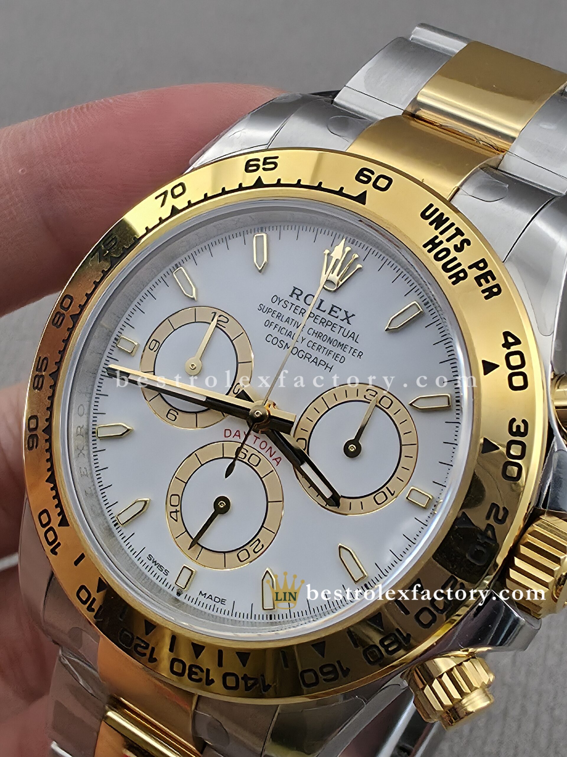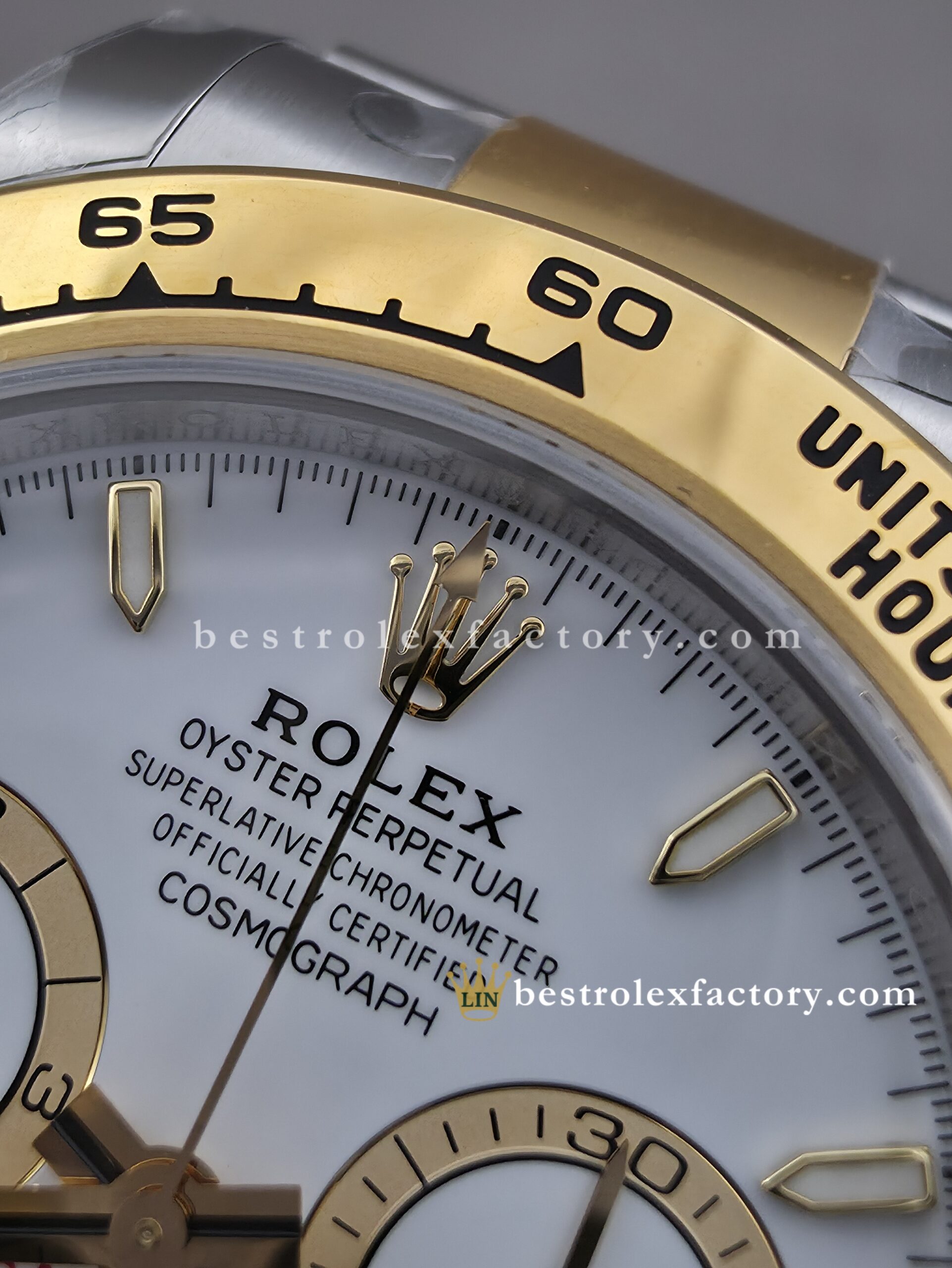 • The case and bracelet are crafted in 904L stainless steel wrapped in thick 18k yellow gold—not thin plating that wears through after a season. Each link is machined to precise tolerances with clean transitions between brushed steel and polished gold. The Oysterlock clasp includes the Easylink 5mm extension system, so you can micro-adjust the fit just like the genuine. On the wrist, you feel the difference—everything fits and finishes perfectly.