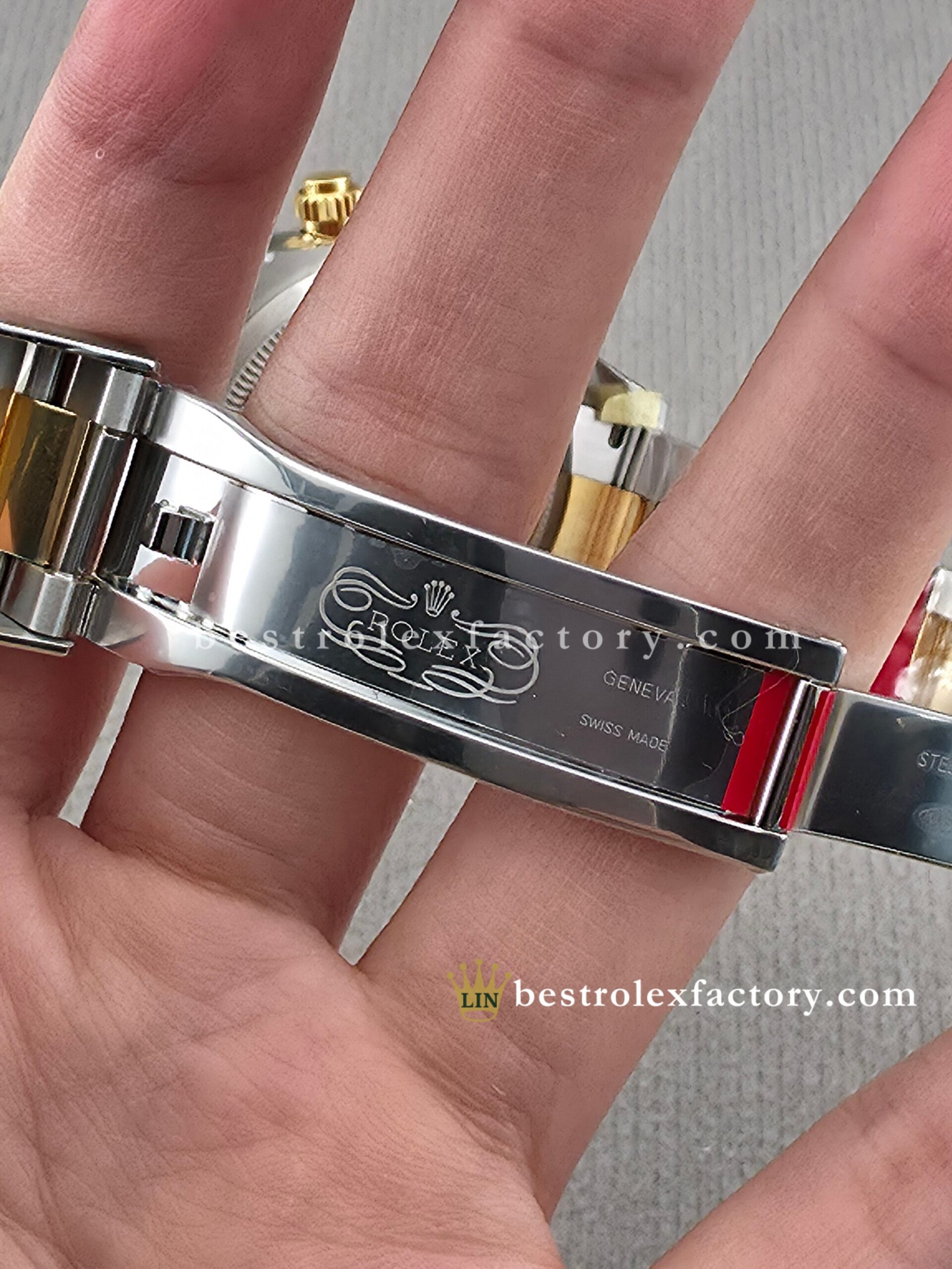 • The two-tone construction is an art in itself. Gold components—bezel, crown, and center links—are batch-matched from the same alloy source to ensure uniform tone. Other suppliers often mix batches, creating subtle but noticeable color variations. Here, every transition stays crisp and consistent, year after year.