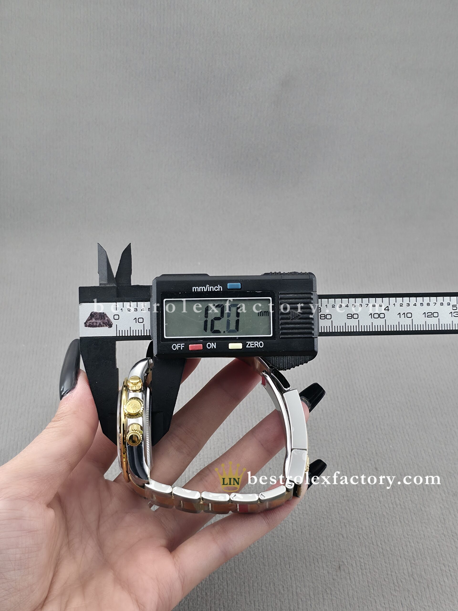 • At 40mm wide and 12.4mm thick, this build maintains authentic Rolex proportions while offering 100M water resistance thanks to specialized gaskets around the crown and pushers. All the visual cues—engraved crown, tachymeter bezel, crisp markers—reinforce the quality and realism.