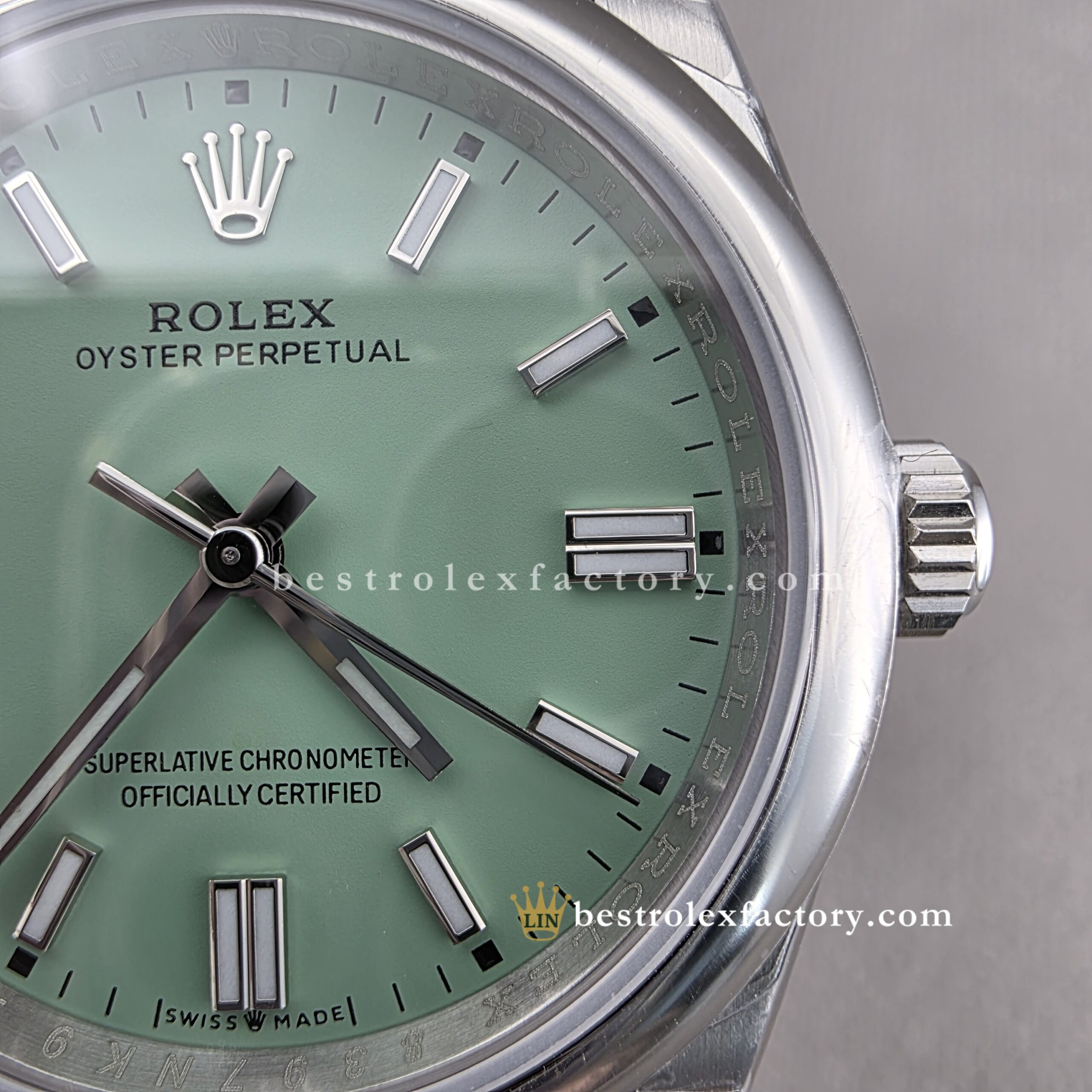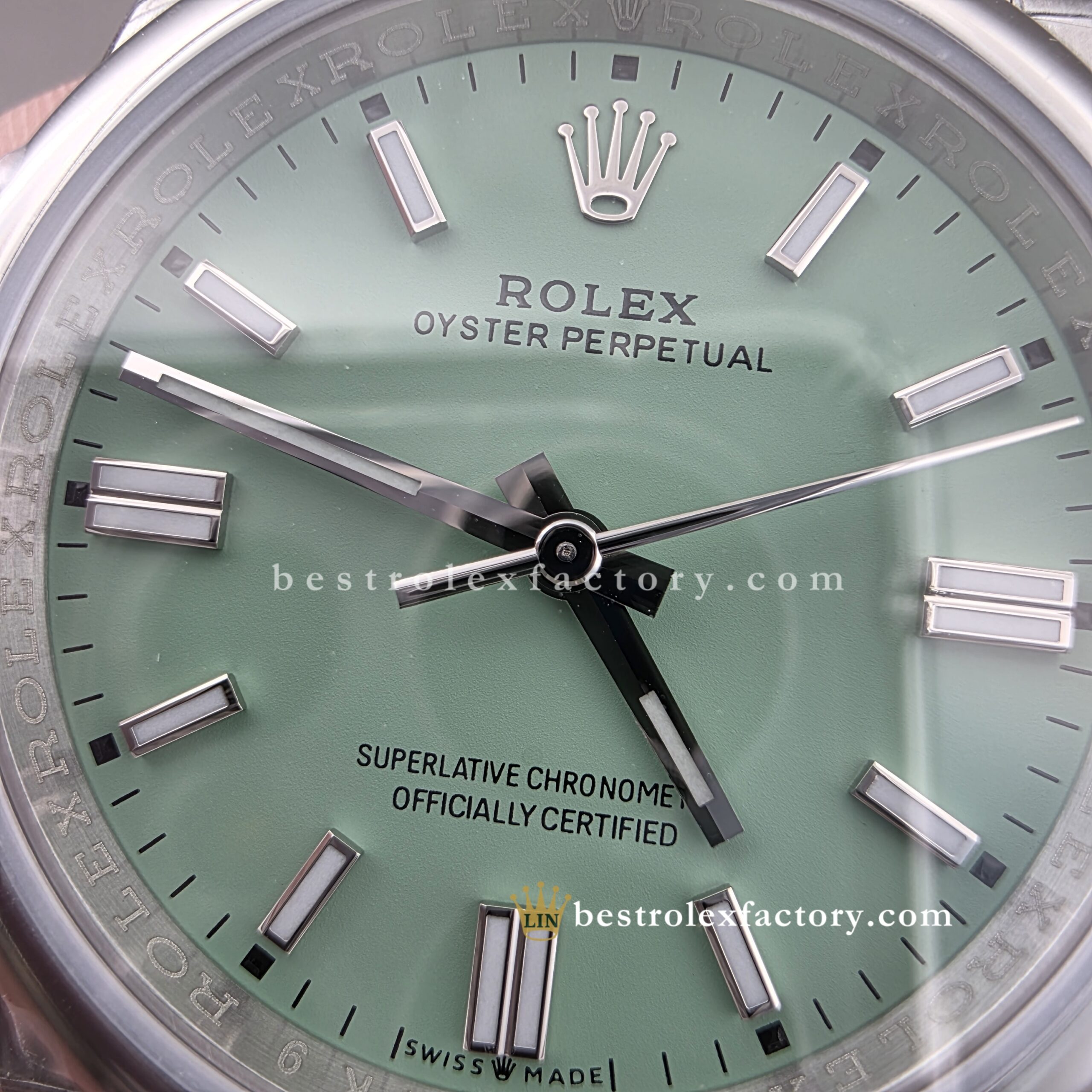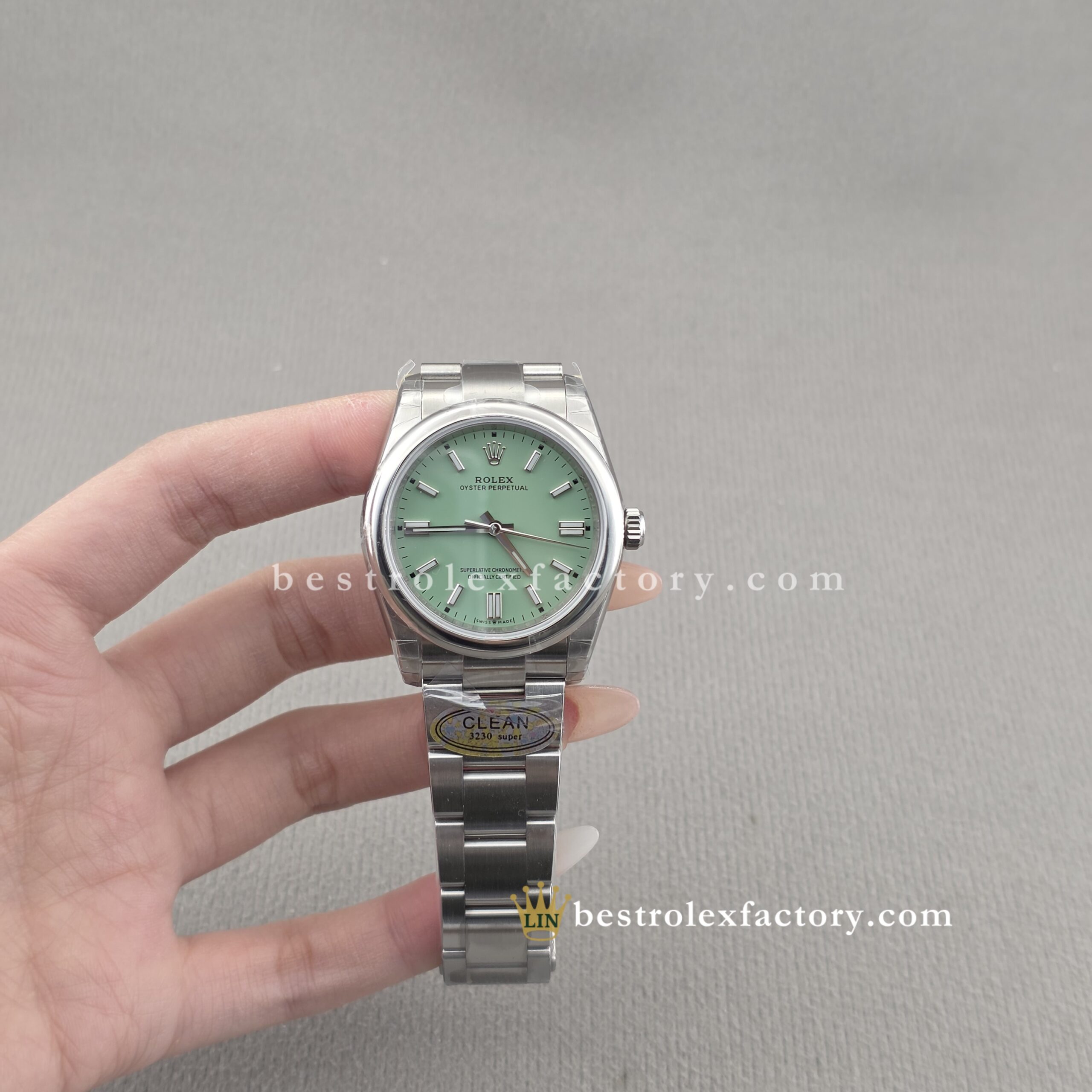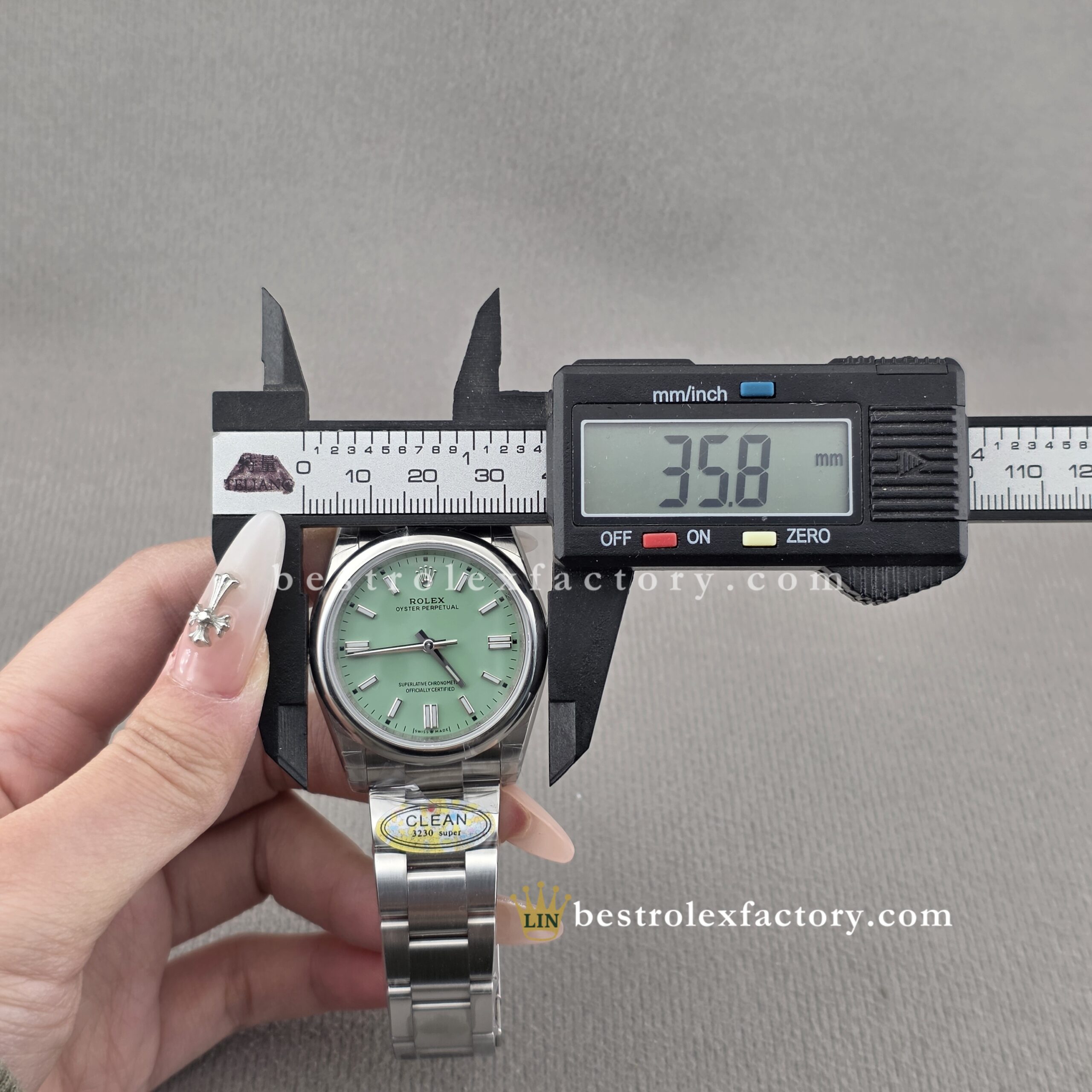 - Clean Factory’s Rolex Oyster Perpetual 126000-0011 with pistachio dial combines classic 36mm sizing with contemporary color appeal. This creamy light green offers a fresh alternative to traditional dial colors—warm and inviting without being too bold. The 36mm case provides timeless proportions that work beautifully with this subtle shade, creating a watch that feels both modern and classic. Clean Factory's super clone 3230 movement ensures authentic performance, with movement letters, numbers, and crown engravings precisely matching genuine specifications.