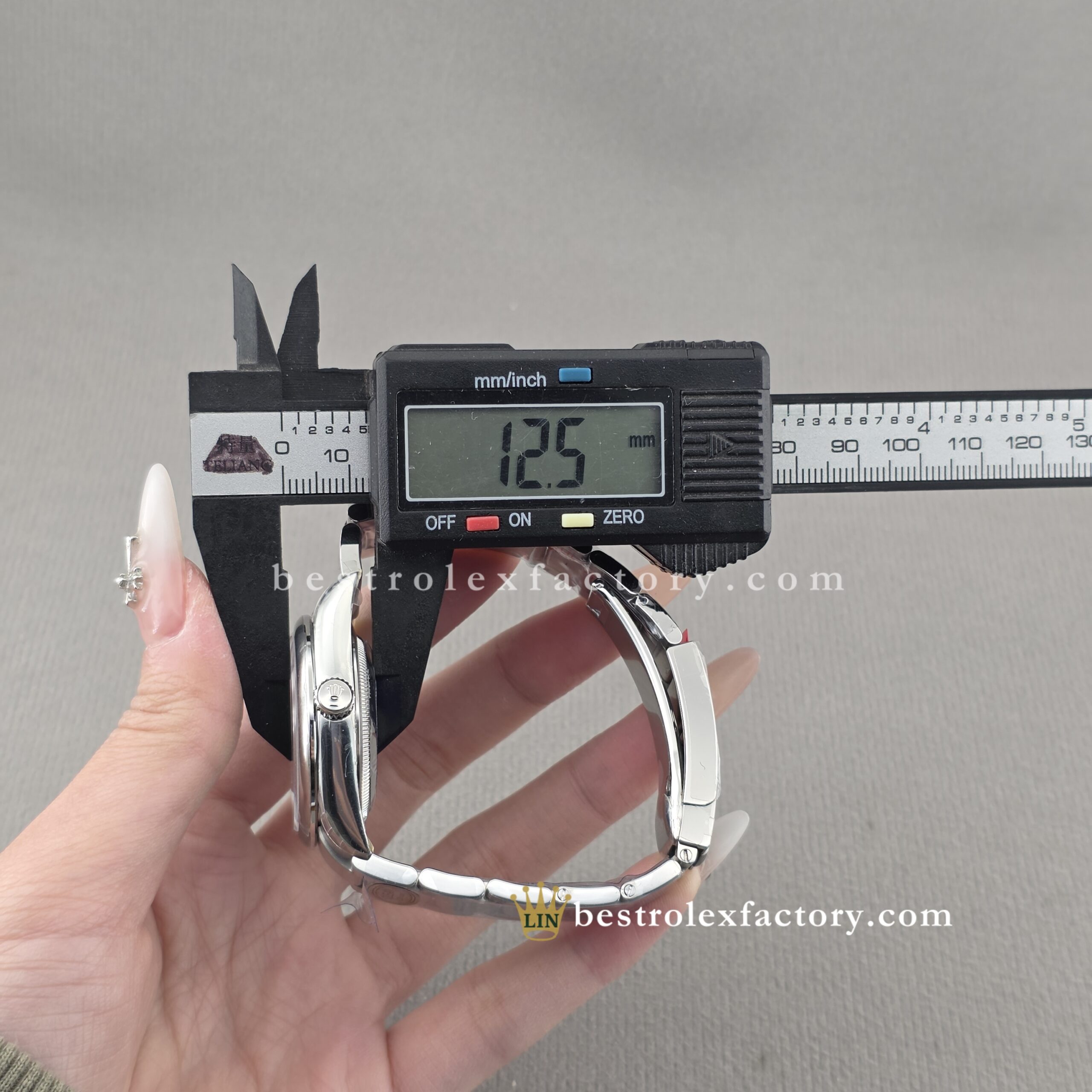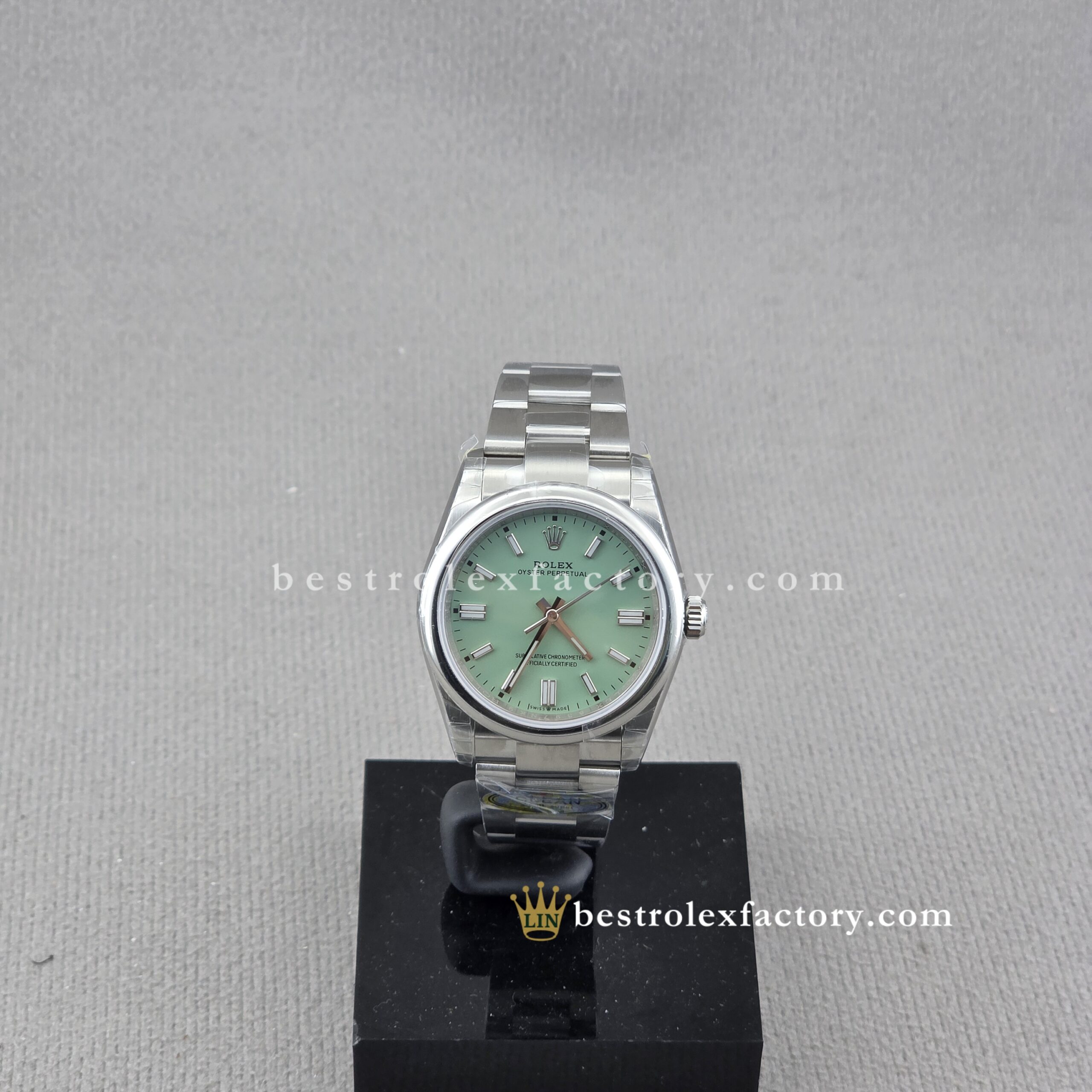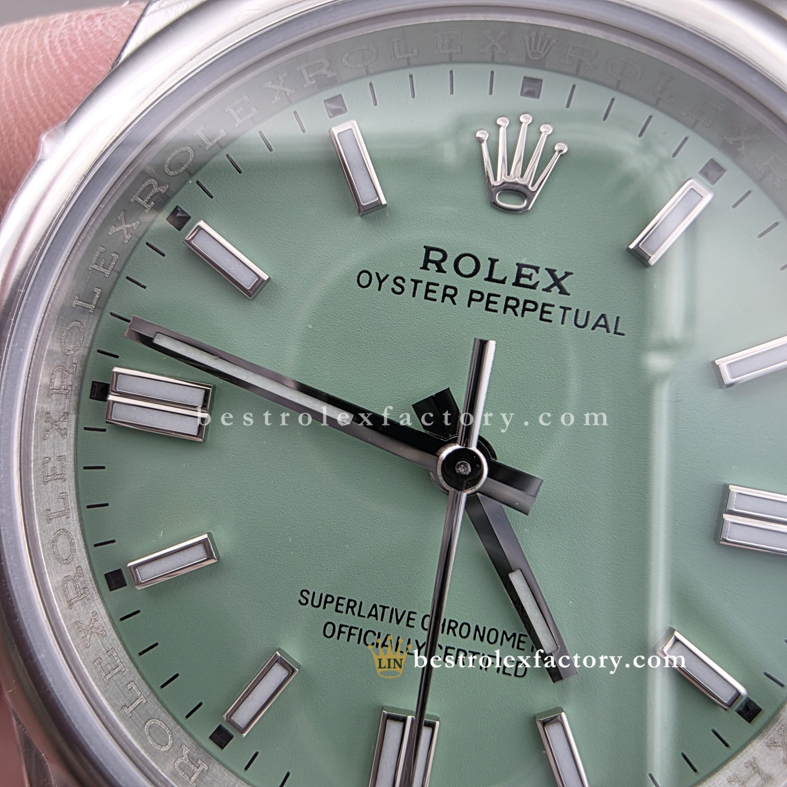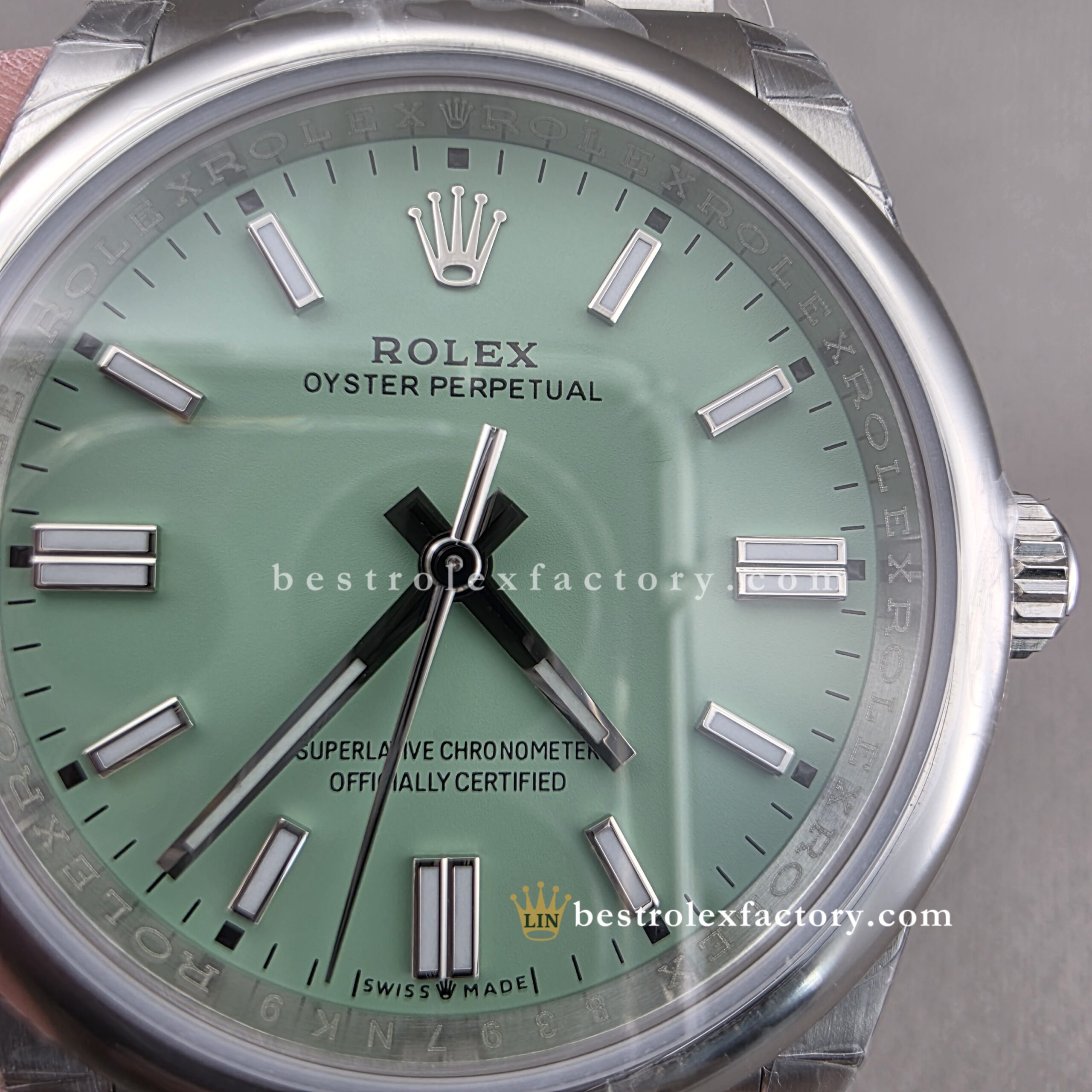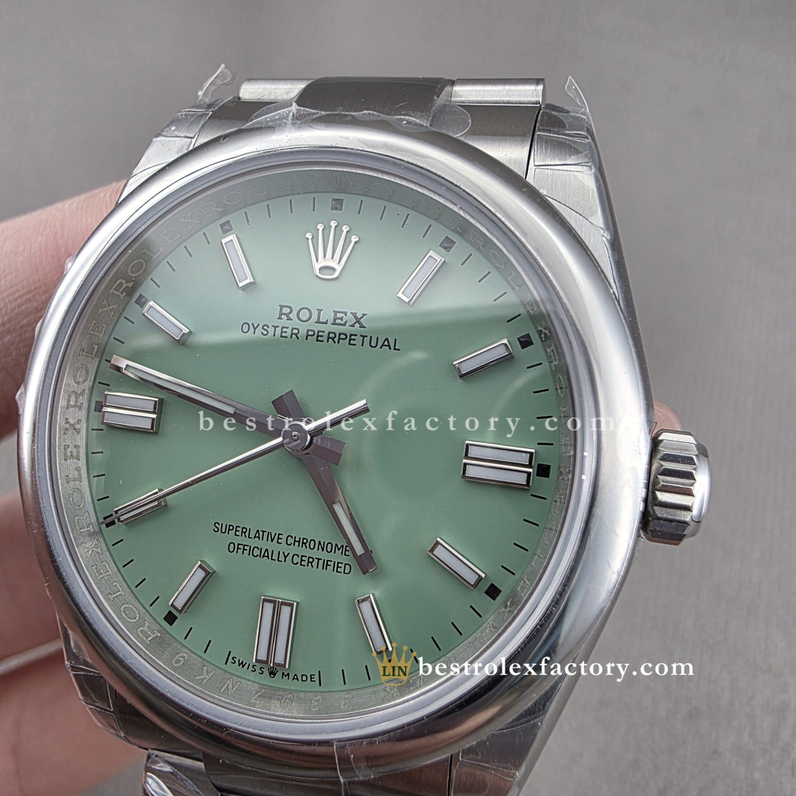 - Clean Factory’s Rolex Oyster Perpetual 126000-0011 with pistachio dial combines classic 36mm sizing with contemporary color appeal. This creamy light green offers a fresh alternative to traditional dial colors—warm and inviting without being too bold. The 36mm case provides timeless proportions that work beautifully with this subtle shade, creating a watch that feels both modern and classic. Clean Factory's super clone 3230 movement ensures authentic performance, with movement letters, numbers, and crown engravings precisely matching genuine specifications.