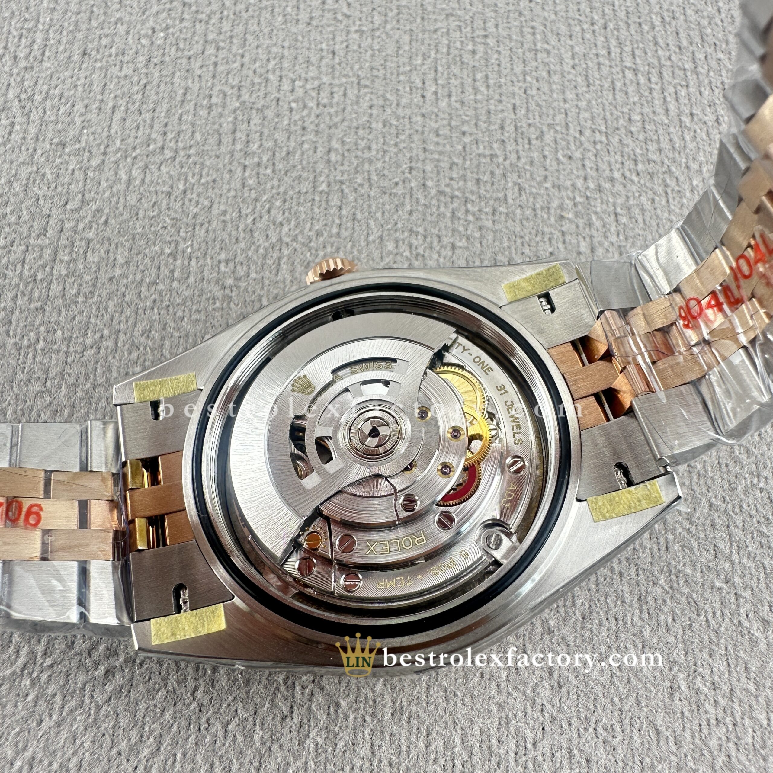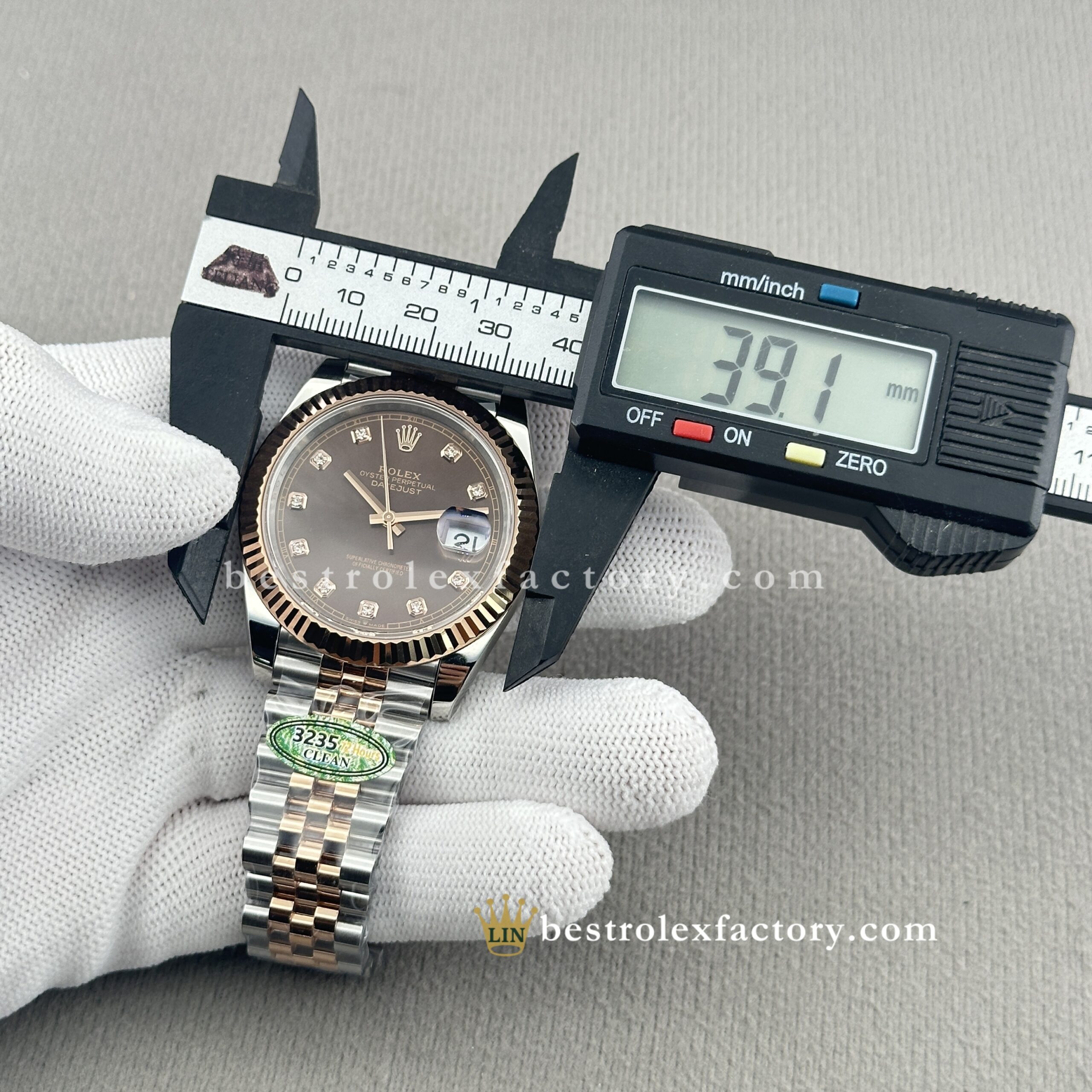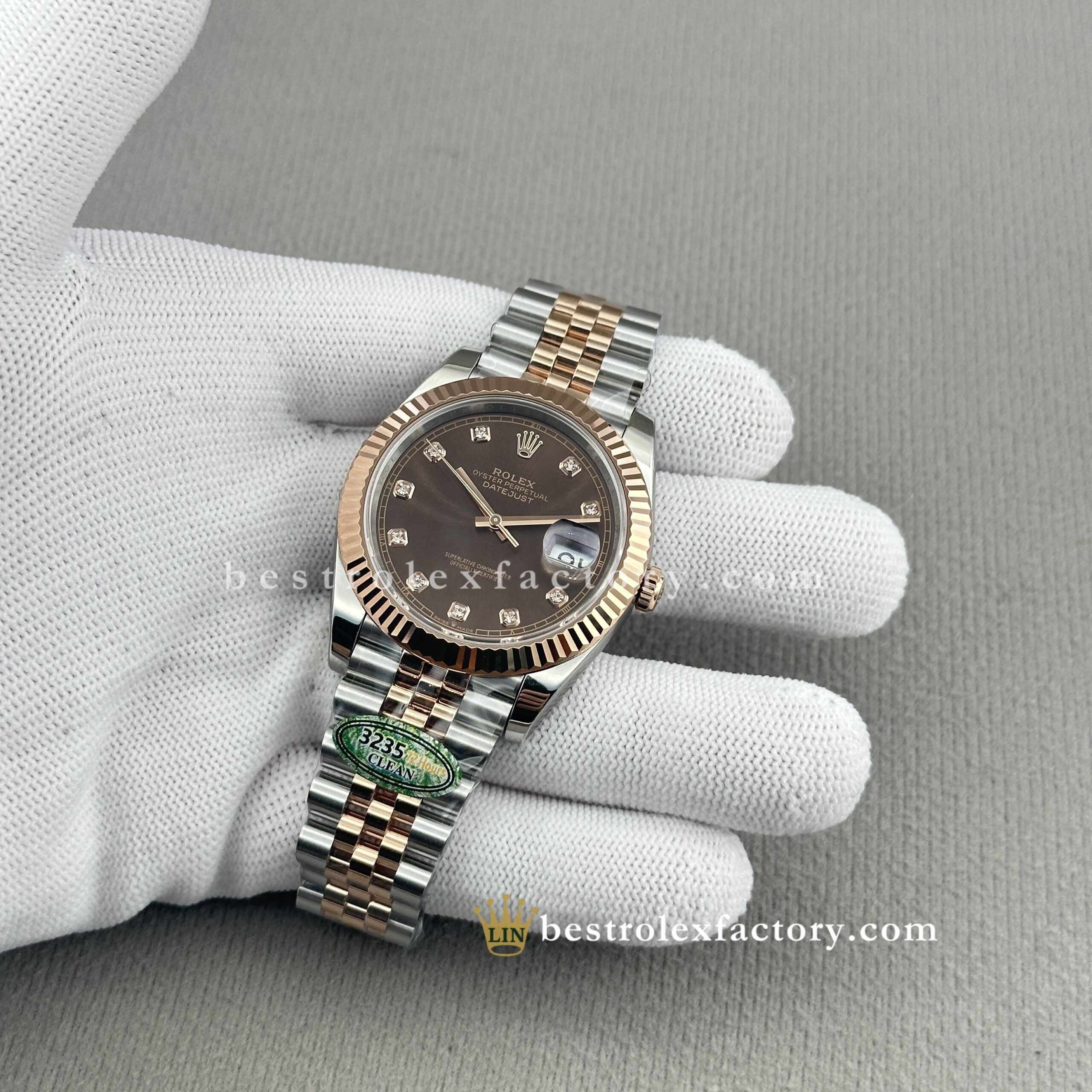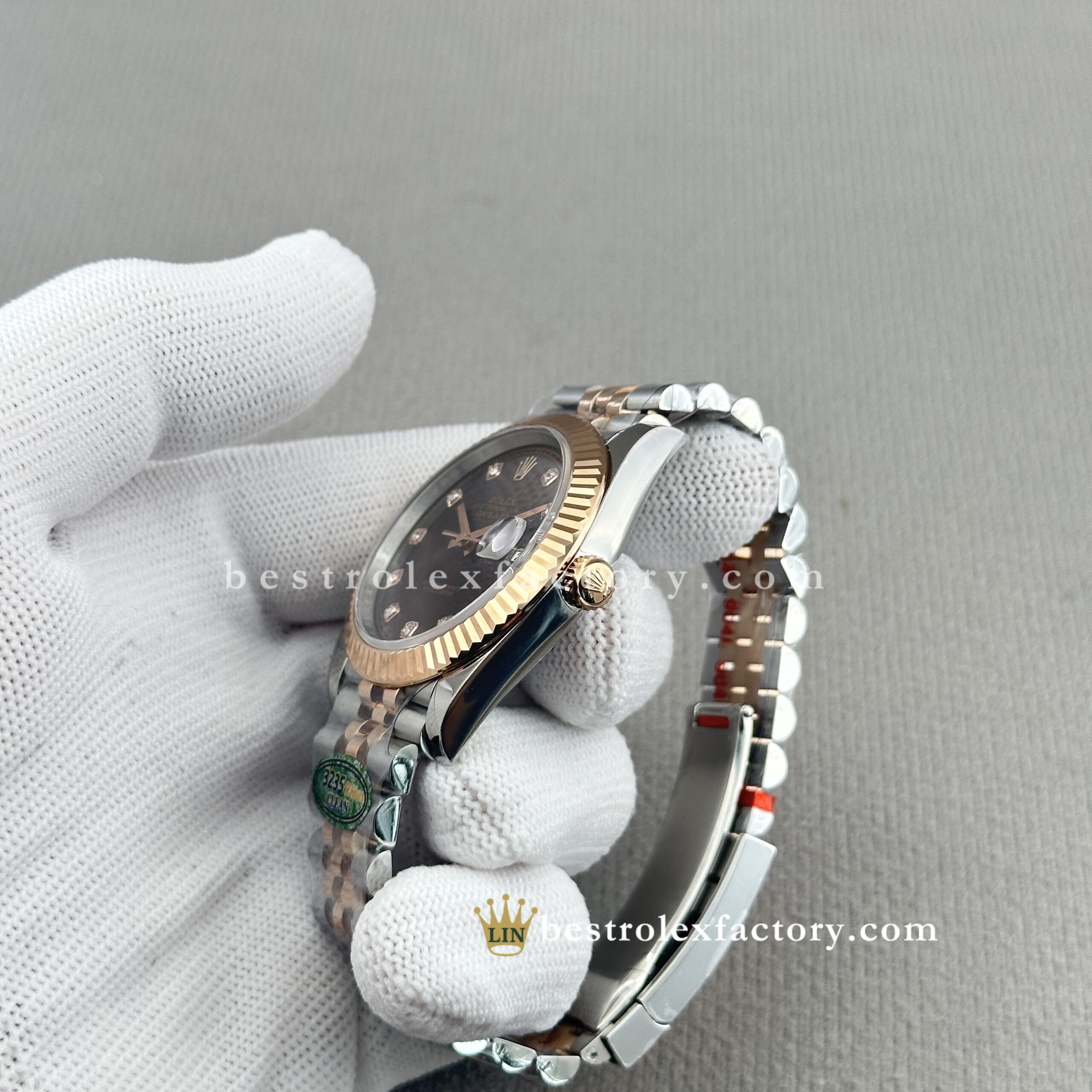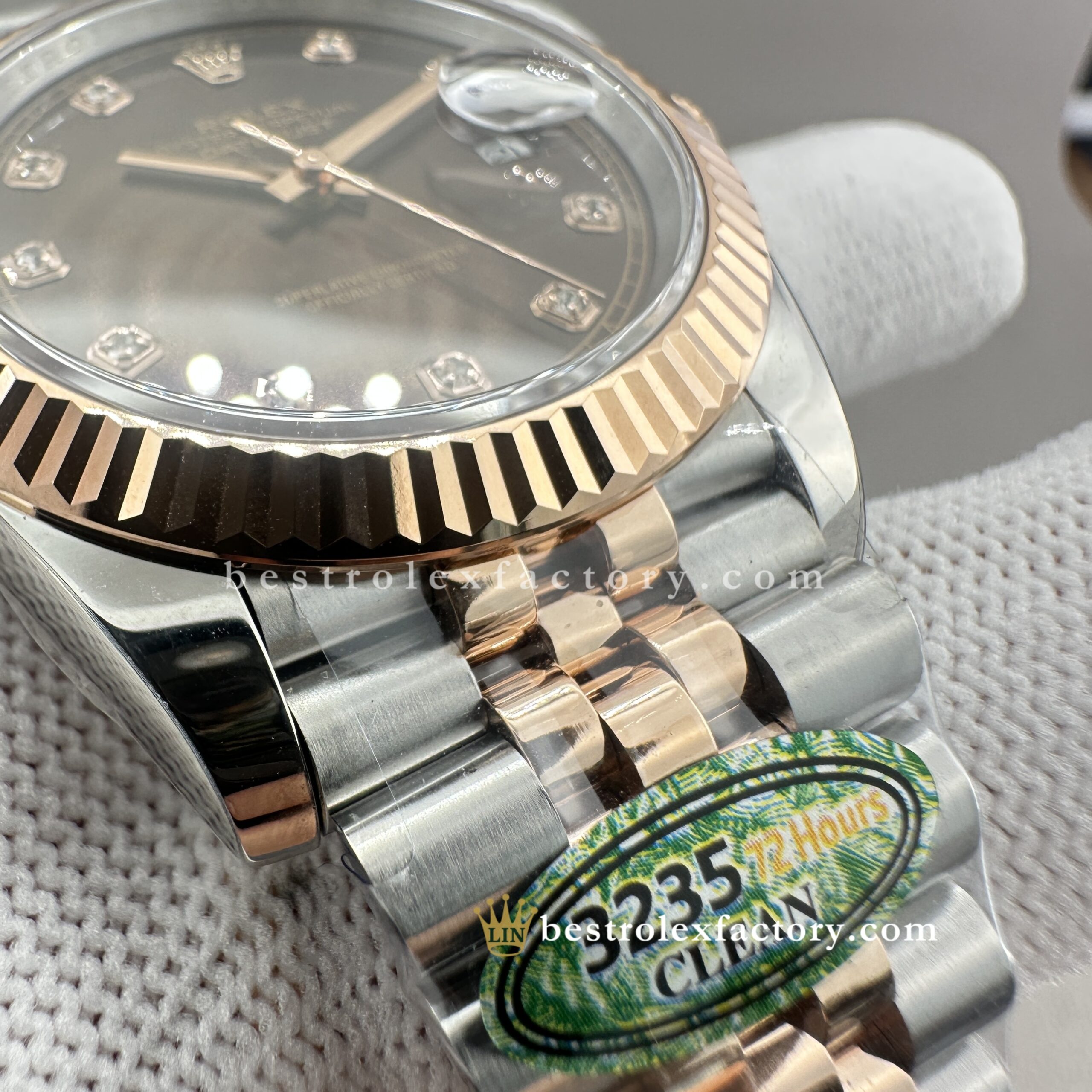 - Clean Factory’s Rolex Datejust 126331-0004 pushes complexity to the absolute limit by adding diamond markers to an already demanding configuration. You’re looking at rose gold fluted bezel wrapping, chocolate dial execution, five-piece Jubilee construction, and top-level moissanite markers—each of these represents a significant manufacturing challenge that most factories can’t even handle individually. Combining them seamlessly is what sets this build apart from anything else in the replica market.