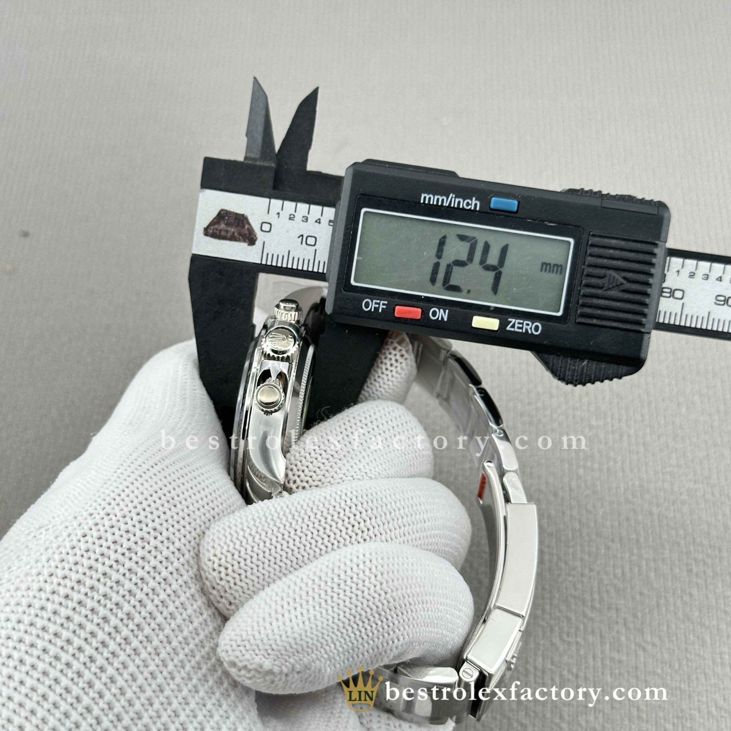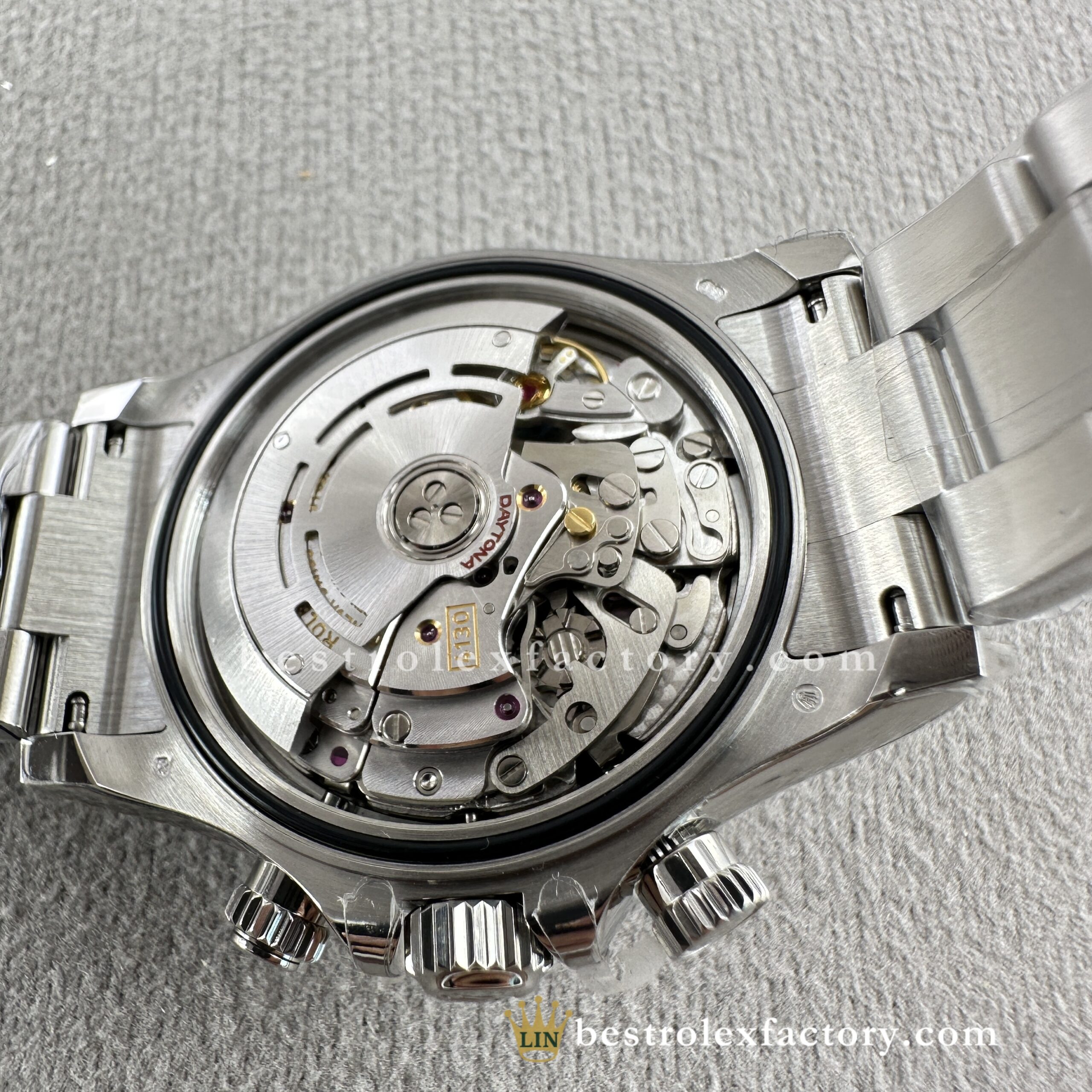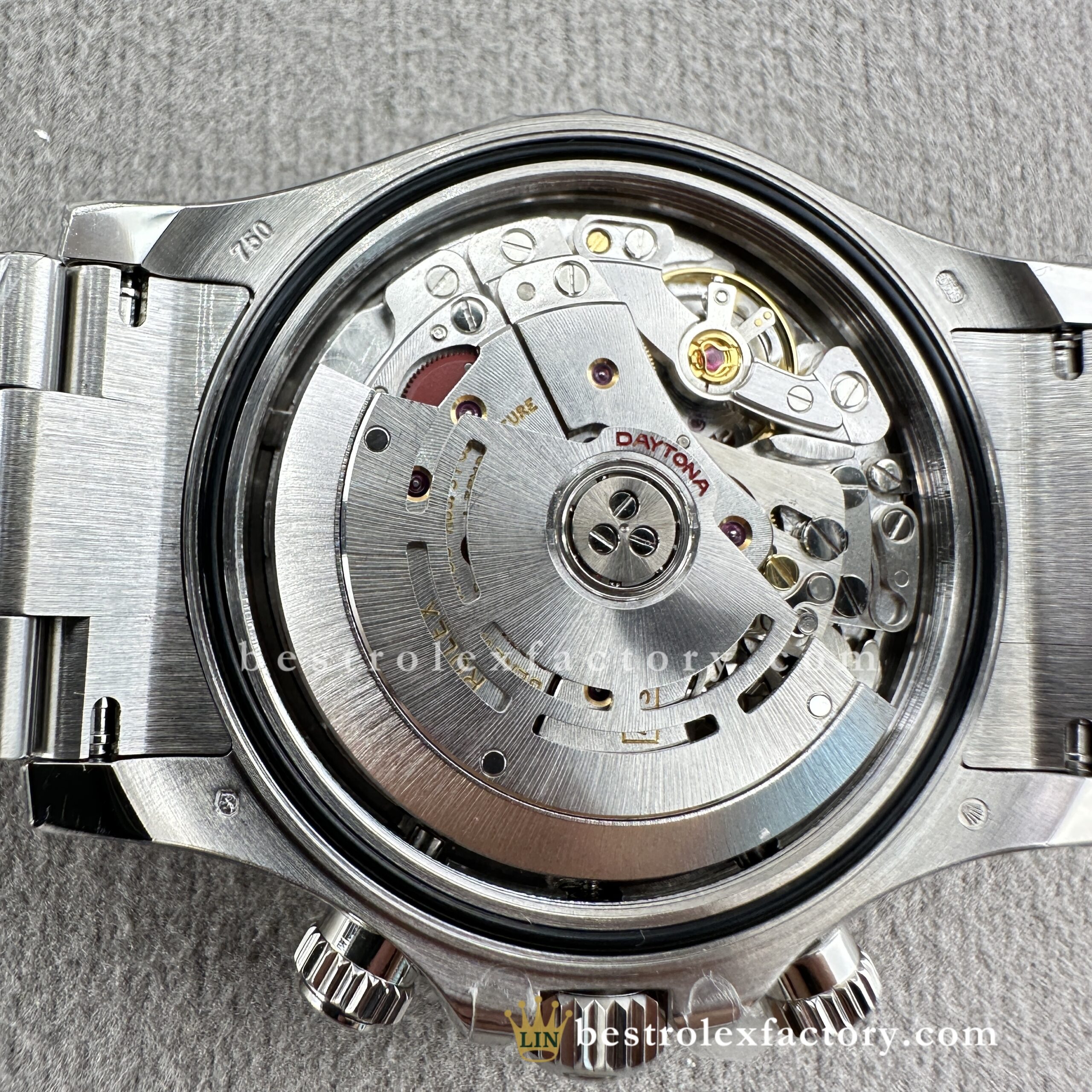 - Case machining is crucial here. White gold requires exact tolerances because of plating build-up. If you’re off by fractions of a millimeter, the movement won’t seat properly. Clean Factory CNC machines every case to exact 40mm × 12.4mm proportions so the super clone 4130 movement fits perfectly. This guarantees full 100M water resistance and a chronograph sweep that’s smooth and consistent.