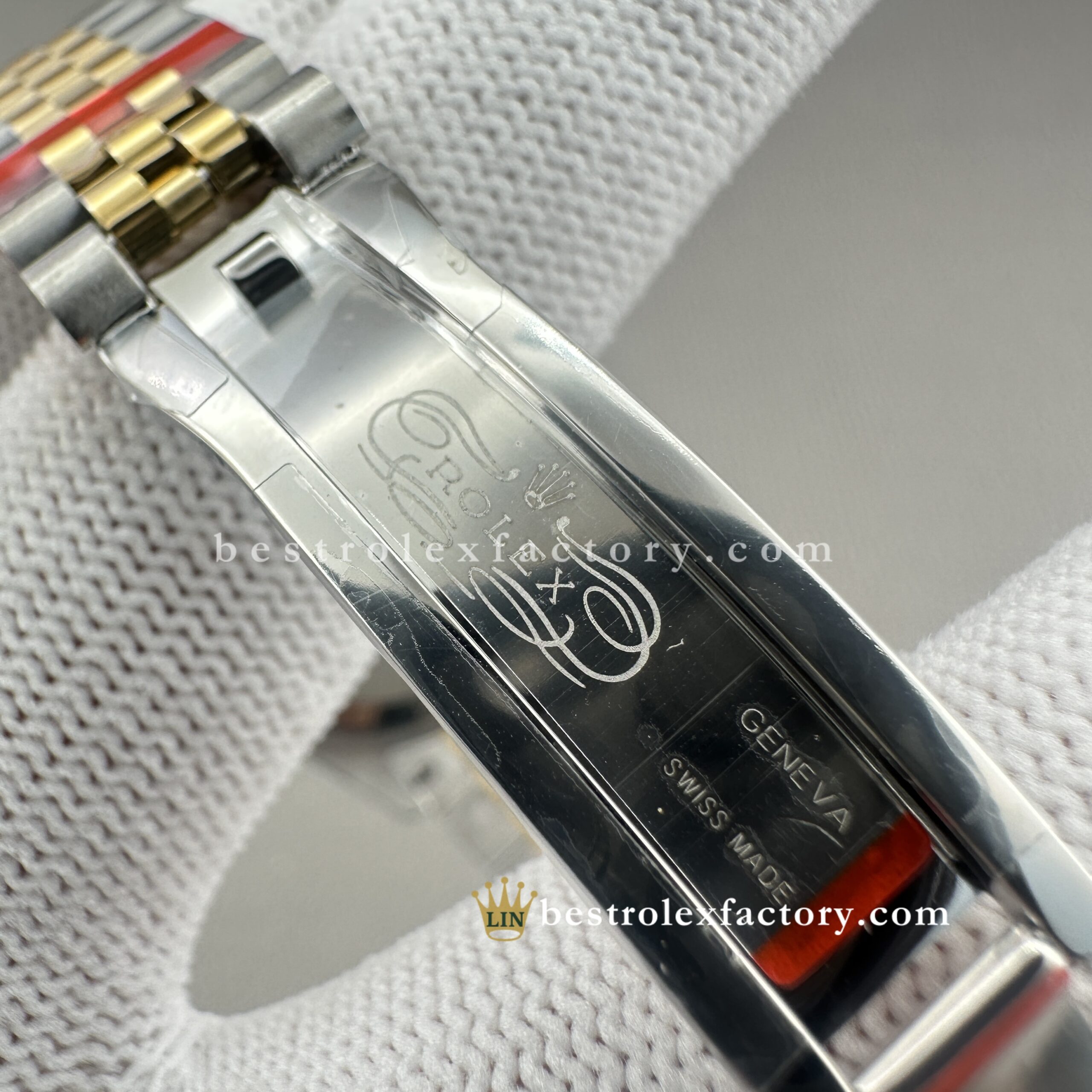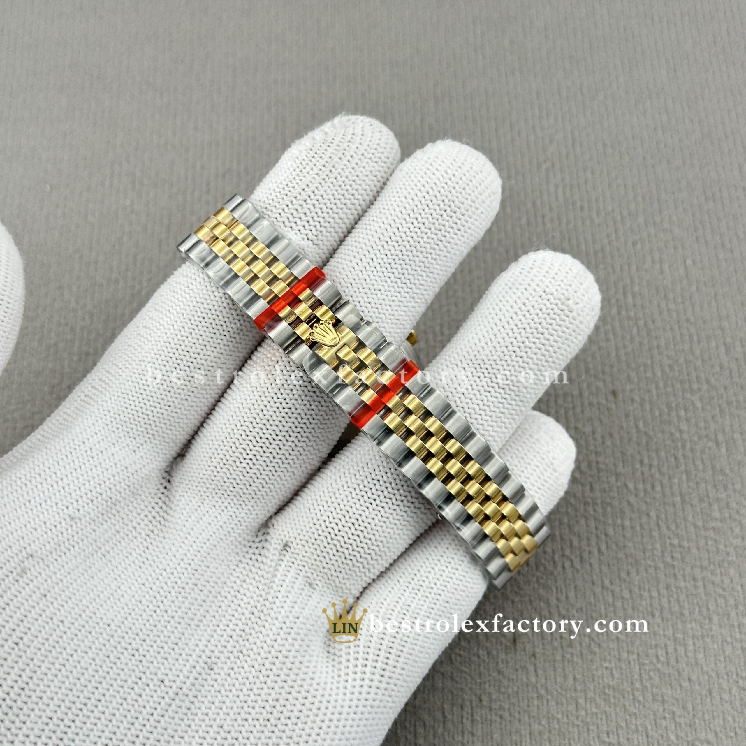 - The two-tone Jubilee bracelet ties it all together. The contrast between brushed steel outer links and polished yellow gold centers creates a rhythmic flow around the wrist. Clean Factory maintains distinct finishing throughout, so each texture plays its part. The five-link design feels luxurious without being heavy, and the concealed clasp closes with the satisfying click of something well made.